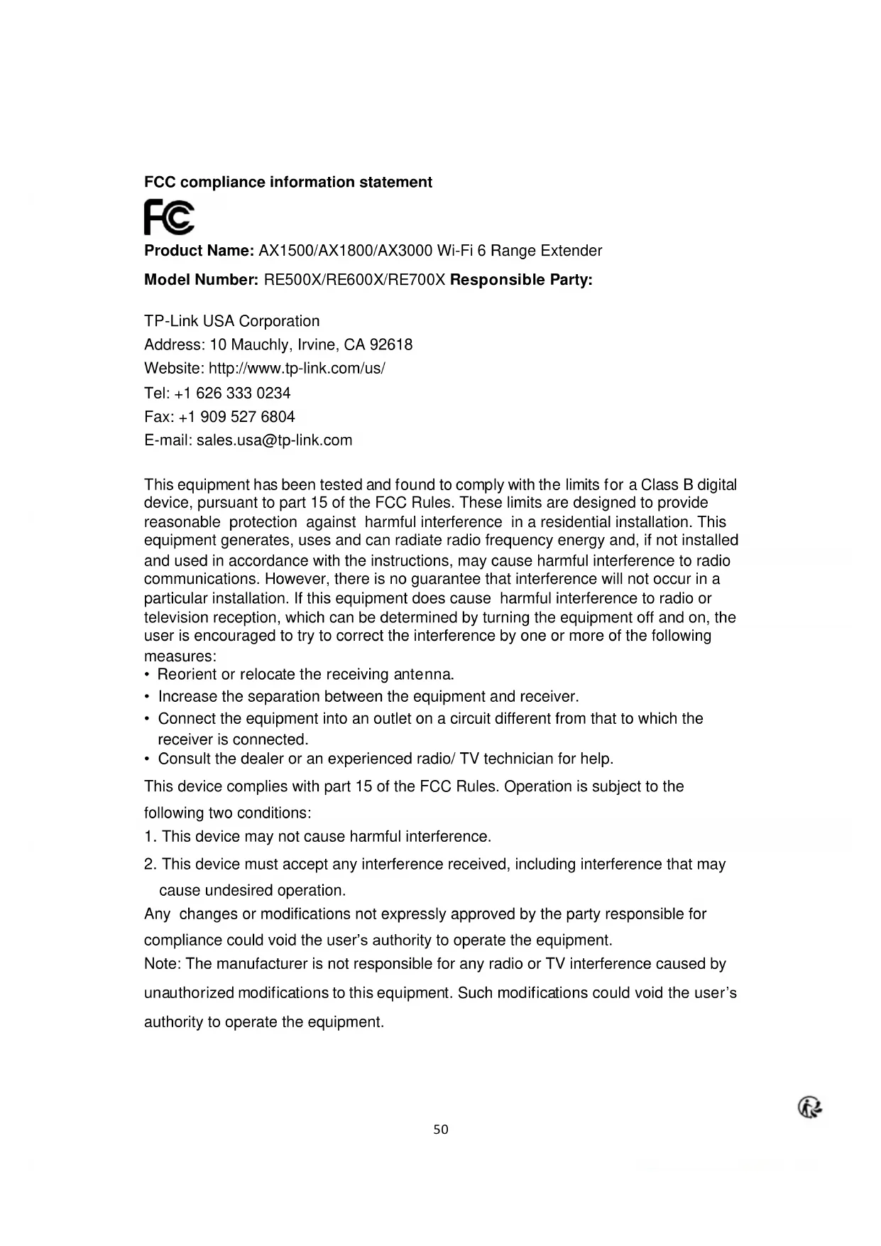 Product Name: AX1500/AX1800/AX3000 Wi-Fi 6 Range Extender Model Number: RE500X/RE600X/RE700X Responsible Party: TP-Link USA Corporation Address: 10 Mauchly, Irvine, CA 92618 Website: http://www.tp-link.com/us/ Tel: +1 626 333 0234 Fax: +1 909 527 6804 E-mail: sales.usa@tp-link.com This equipment has been tested and found to comply with the limits for a Class B digital device, pursuant to part 15 of the FCC Rules. These limits are designed to provide reasonable protection against harmful interference in a residential installation. This equipment generates, uses and can radiate radio frequency energy and, if not installed and used in accordance with the instructions, may cause harmful interference to radio communications. However, there is no guarantee that interference will not occur in a particular installation. If this equipment does cause harmful interference to radio or television reception, which can be determined by turning the equipment off and on, the user is encouraged to try to correct the interference by one or more of the following measures: