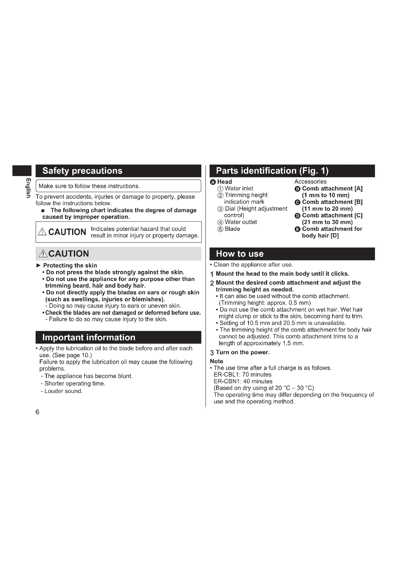 - The use time after a full charge is as follows. ER‑CBL1: 70 minutes ER‑CBN1: 40 minutes (Based on dry using at 20 °C – 30 °C) The operating time may differ depending on the frequency of use and the operating method.7 English Quickcharge(ER‑CBL1only) Even though the battery runs out, you can use for 5 minutes after 3‑minute charge. (This will differ depending on usage.) Removing and mounting thehead(Fig.2)