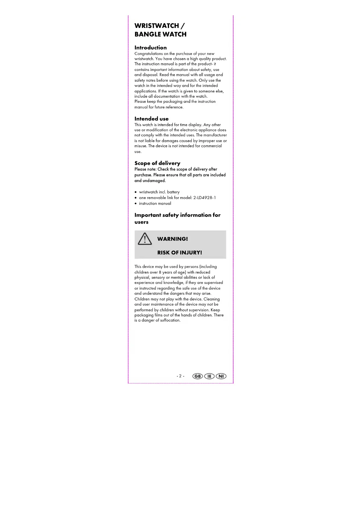 WRISTWATCH / BANGLE WATCH Introduction Congratulations on the purchase of your new wristwatch. You have chosen a high quality product. The instruction manual is part of the product- it contains important information about safety, use and disposal. Read the manual with all usage and safety notes before using the watch. Only use the watch in the intended way and for the intended applications. If the watch is given to someone else, include all documentation with the watch. Please keep the packaging and the instruction manual for future reference. Intended use This watch is intended for time display. Any other use or modification of the electronic appliance does not comply with the intended uses. The manufacturer is not liable for damages caused by improper use or misuse. The device is not intended for commercial use. Scope of delivery Please note: Check the scope of delivery after purchase. Please ensure that all parts are included and undamaged. wristwatch incl. battery one removable link for model: 2-LD4928-1 instruction manual Important safety information for users