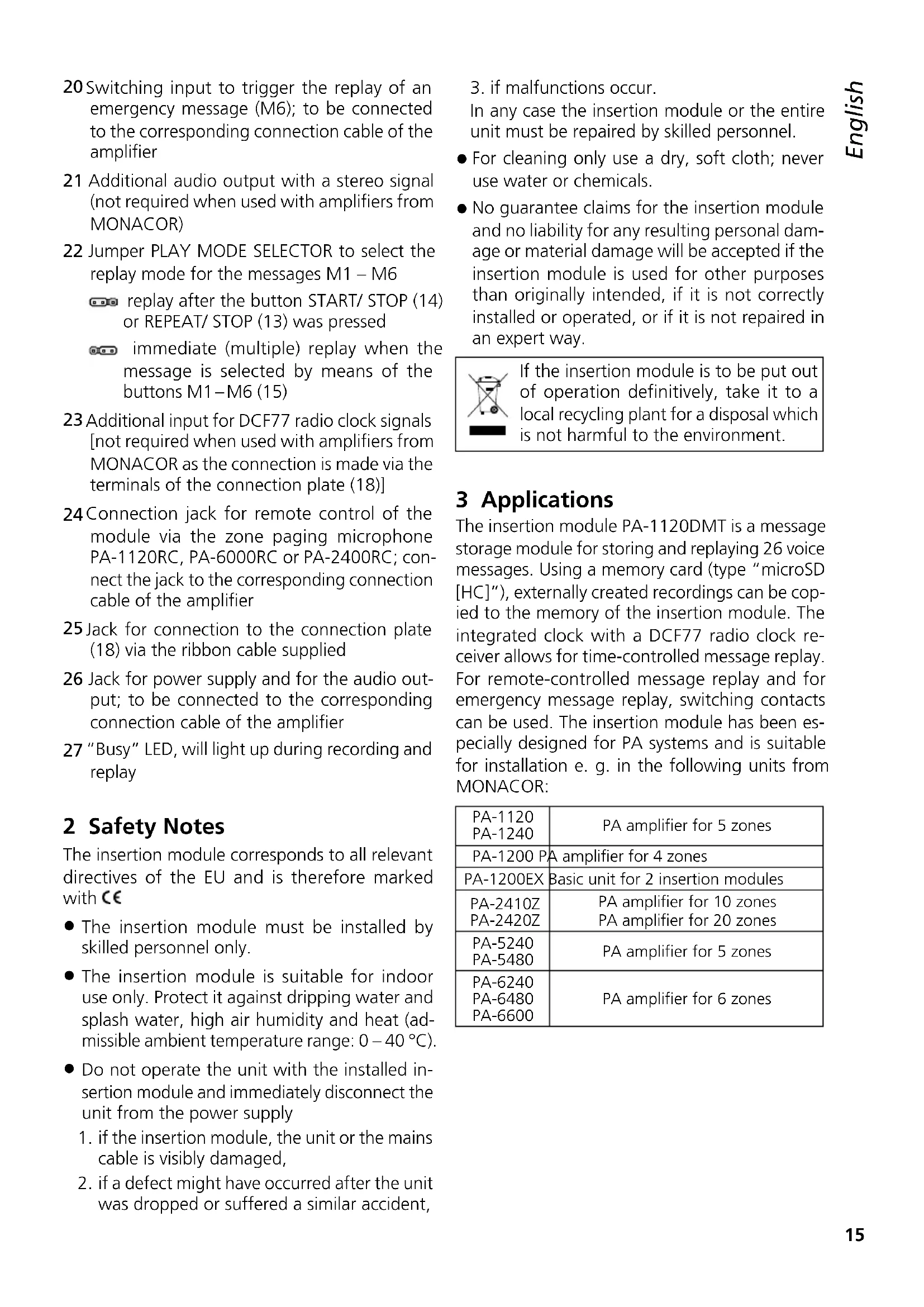 No guarantee claims for the insertion module and no liability for any resulting personal dam- age or material damage will be accepted if the insertion module is used for other purposes than originally intended, if it is not correctly installed or operated, or if it is not repaired in an expert way. If the insertion module is to be put out of operation definitively, take it to a local recycling plant for a disposal which is not harmful to the environment. 3 Applications The insertion module PA-1120DMT is a message storage module for storing and replaying 26 voice messages. Using a memory card (type “microSD [HC]”), externally created recordings can be cop- ied to the memory of the insertion module. The integrated clock with a DCF77 radio clock re- ceiver allows for time-controlled message replay. For remote-controlled message replay and for emergency message replay, switching contacts can be used. The insertion module has been es- pecially designed for PA systems and is suitable for installation e. g. in the following units from MONACOR: PA-1120 PA-1240PA amplifier for 5 zonesPA-1200 PA amplifier for 4 zonesPA-1200EX Basic unit for 2 insertion modulesPA-2410Z PA-2420ZPA amplifier for 10 zonesPA amplifier for 20 zonesPA-5240 PA-5480PA amplifier for 5 zonesPA-6240 PA-6480 PA-6600PA amplifier for 6 zones16 English