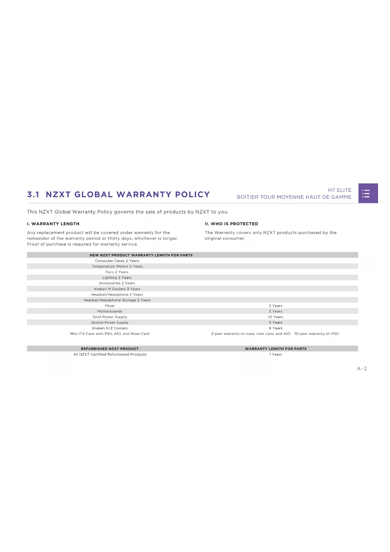 The Warranty covers only NZXT products purchased by the original consumer. NEW NZXT PRODUCT WARRANTY LENGTH FOR PARTS Computer Cases 2 Years Temperature Meters 2 Years Fans 2 Years Lighting 2 Years Accessories 2 Years Kraken M Coolers 3 Years Headset/Headphone 2 Years Headset/Headphone Storage 2 Years Mixer 2 Years Motherboards 3 Years Gold Power Supply 10 Years Bronze Power Supply 5 Years Kraken X/Z Coolers 6 Years Mini ITX Case with PSU, AIO, and Riser Card 3-year warranty on case, riser card, and AIO. 10-year warranty on PSU. REFURBISHED NZXT PRODUCT WARRANTY LENGTH FOR PARTS All NZXT Certified Refurbished Products 1 YearsA-3 H7 ELITE BOÎTIER TOUR MOYENNE HAUT DE GAMME