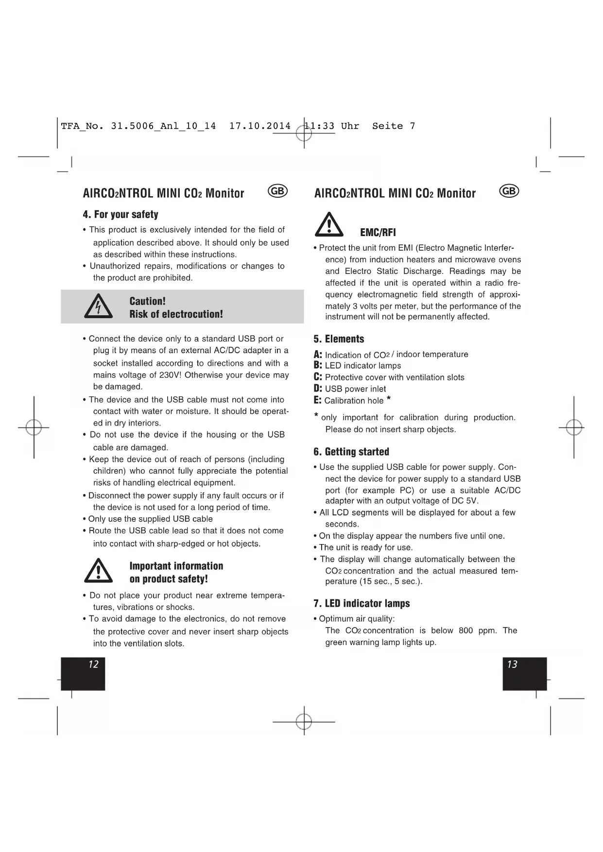 TFA Dostmann GmbH & Co.KG Zum Ottersberg 12, D-97877 Wertheim. No part of this manual may be reproduced without written con- sent of TFA Dostmann. The technical data are correct at the time of going to print and may change without prior notice.The latest technical data and information about your product can be found by entering your product number on our homepage www.tfa-dostmann.de 10/14 Response time Approximately 2 minutes for 63% of step change Warm-up time < 60 seconds Measuring method Non-Dispersive-Infrared Technology (NDIR) Temperature Measuring range 0 °C…50°C Resolution 0,1 °C Accuracy ±1,5 °C Response time 20…30 minutes (device must equalize with environment) Operating temperature 0 °C…50 °C Storage temperature -10 °C…60 °C Dimensions 116 x 24 x 42 mm Weight 65 g (instrument only) TFA_No. 31.5006_Anl_10_14 17.10.2014 11:33 Uhr Seite 918 AIRCO2NTROL MINI Moniteur CO2 AIRCO2NTROL MINI Moniteur CO2