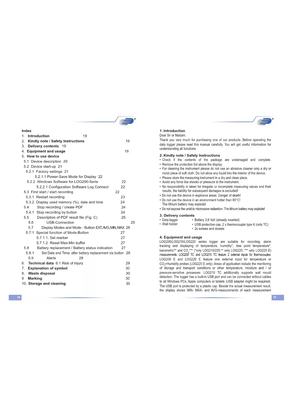 - 2x screws and dowels2120 channel. The bottom status line shows battery capacity, logger mode and alarm status. The green LED ashes every 30 seconds during recording. The red LED is used to display limit alarms or status messages (battery change ...etc.). The logger also has an internal buzzer that supports the user interface. This product is exclusively intended for the eld of application described above. It should only be used as described within these instructions.Unauthorized repairs, modications or changes to the product are prohibited and void any warranty!