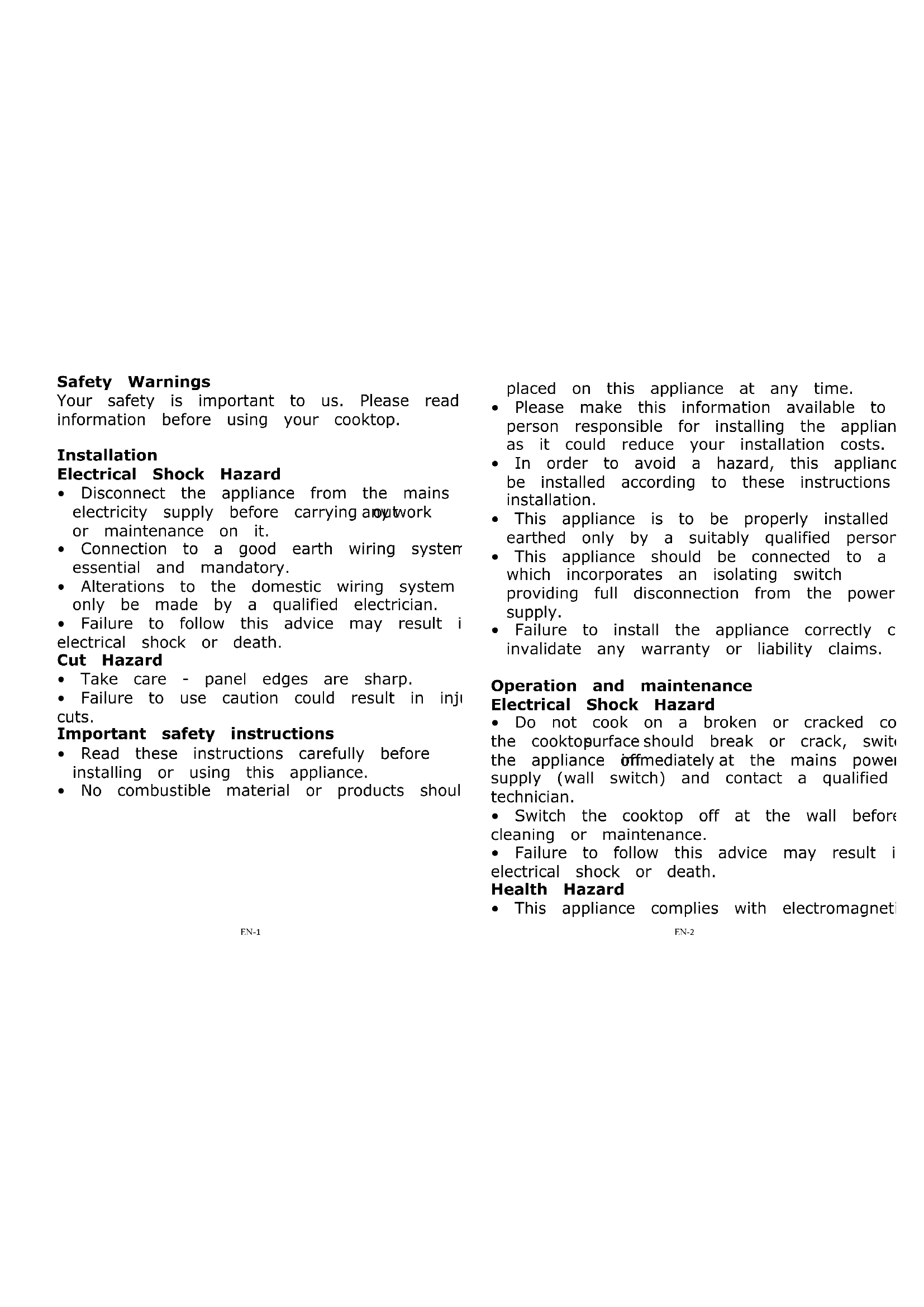 eEN-1 Safety Warnings Your safety is important to us. Please read this information before using your cooktop. Installation Electrical Shock Hazard