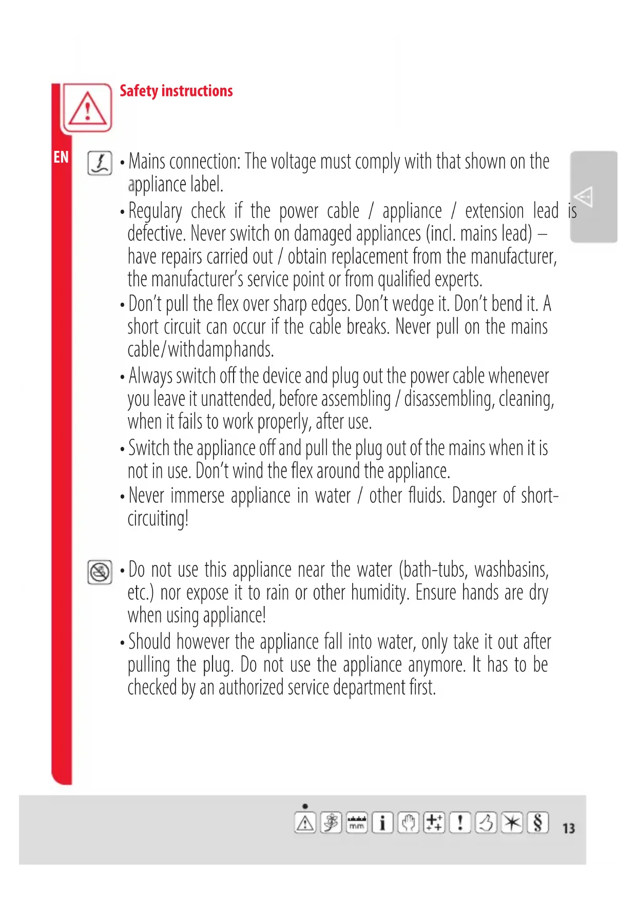 - Do not use this appliance near the water (bath-tubs, washbasins, etc.) nor expose it to rain or other humidity. Ensure hands are dry when using appliance!14 Safety instructions