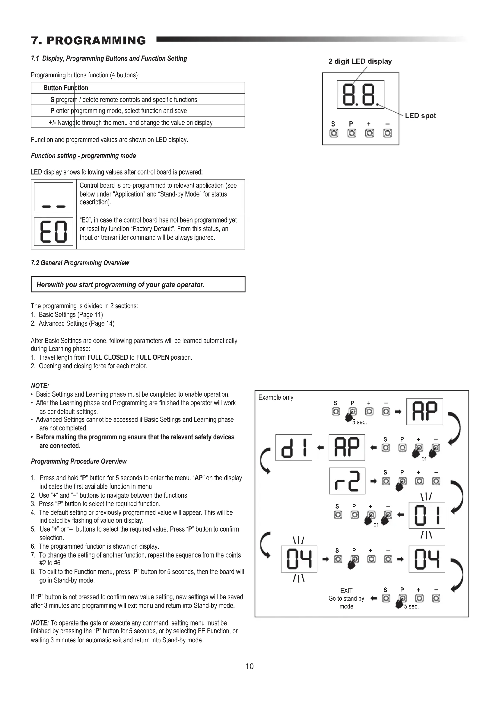 go in Stand-by mode. If “P” button is not pressed to conrm new value setting, new settings will be saved after 3 minutes and programming will exit menu and return into Stand-by mode. NOTE: To operate the gate or execute any command, setting menu must be nished by pressing the “P” button for 5 seconds, or by selecting FE Function, or waiting 3 minutes for automatic exit and return into Stand-by mode. Control board is pre-programmed to relevant application (see below under “Application” and “Stand-by Mode” for status description). “E0”, in case the control board has not been programmed yet or reset by function “Factory Default”. From this status, an Input or transmitter command will be always ignored. Example only 2 digit LED display LED spot Herewith you start programming of your gate operator. Programming buttons function (4 buttons):11