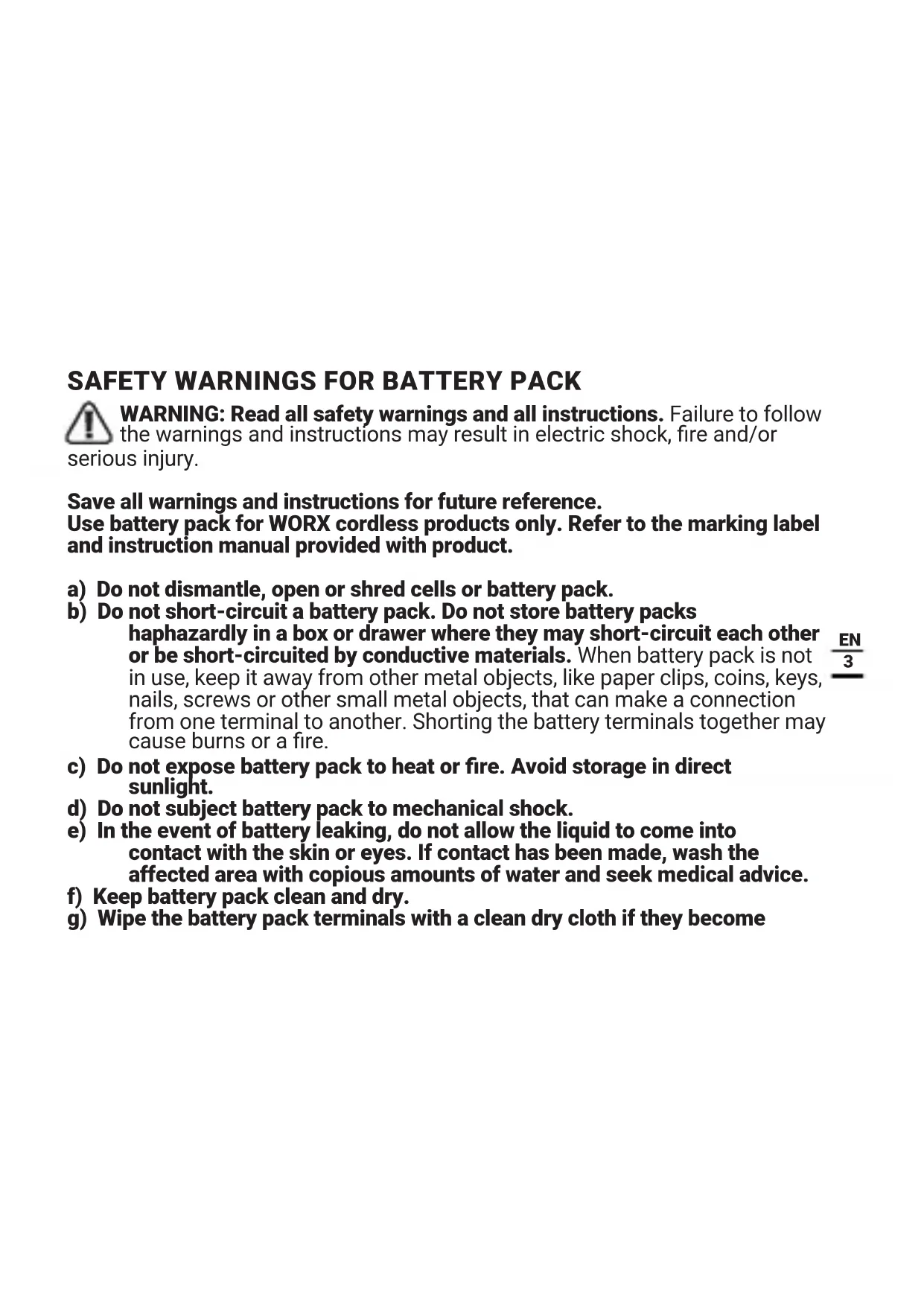 Use battery pack for WORX cordless products only. Refer to the marking label and instruction manual provided with product.