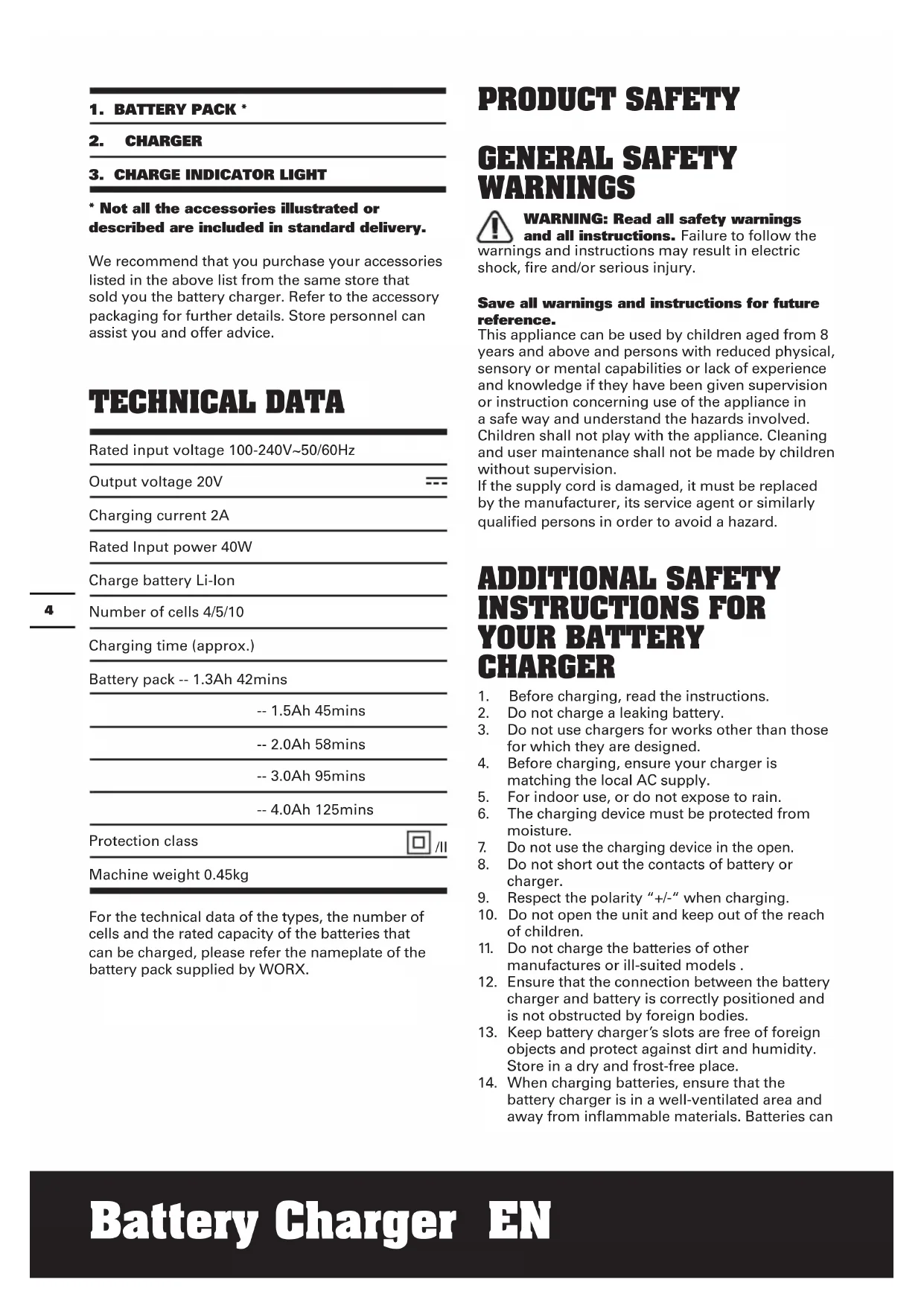 - Not all the accessories illustrated or described are included in standard delivery. We recommend that you purchase your accessories listed in the above list from the same store that sold you the battery charger. Refer to the accessory packaging for further details. Store personnel can assist you and offer advice. TECHNICAL DATA Rated input voltage 100-240V~50/60Hz Output voltage 20V Charging current 2A Rated Input power 40W Charge battery Li-Ion Number of cells 4/5/10 Charging time (approx.) Battery pack -- 1.3Ah 42mins -- 1.5Ah 45mins -- 2.0Ah 58mins -- 3.0Ah 95mins -- 4.0Ah 125mins Protection class /II Machine weight 0.45kg For the technical data of the types, the number of cells and the rated capacity of the batteries that can be charged, please refer the nameplate of the battery pack supplied by WORX. PRODUCT SAFETY GENERAL SAFETY WARNINGS