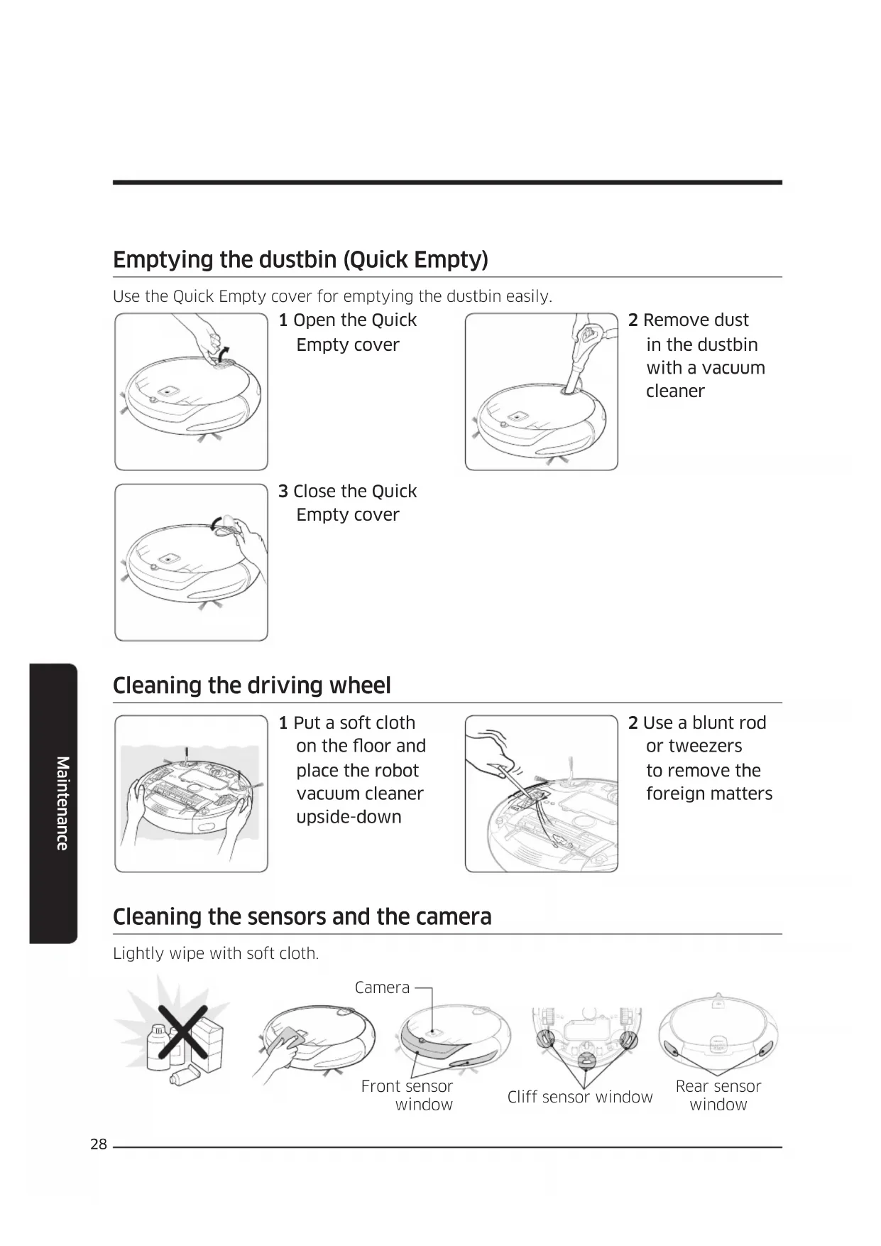 - PresstheSchedulebuttonfor3secondstosetdailyschedule. Select"One-time"or "Daily"schedule Select"Minute"Select"Hour" or or or or Setting complete Startsetting Cancelling during setup CancellingOne-time/Dailyschedule To cancel the one-time schedule Cancelcomplete To cancel the daily schedule Pressfor3sec. Cancelcomplete VR5000_EN_00734A-00.indd 26 2015-02-27 오후 5:54:0927 Maintenance Cleaning and maintaining Youmustturnoffthepowerswitchbeforecleaningtherobotvacuumcleaner. Cleaning the dustbin Cleanthedustbinifthere’stoomuchdustinthedustbin. 1 Remove the dustbin 2 Open the dustbin cover 3 Remove the lter from the dustbin 4 Remove dust in the dustbin and the lter 5 Wash the dustbin and the lter 6 Reassemble the lter into the dustbin 7 Close the dustbin cover 8 Reinsert the dustbin into the robot vacuum cleaner Maintenance VR5000_EN_00734A-00.indd 27 2015-02-27 오후 5:54:1028 Maintenance Emptying the dustbin (Quick Empty) UsetheQuickEmptycoverforemptyingthedustbineasily. 1 Open the Quick Empty cover 2 Remove dust in the dustbin with a vacuum cleaner 3 Close the Quick Empty cover Cleaning the driving wheel