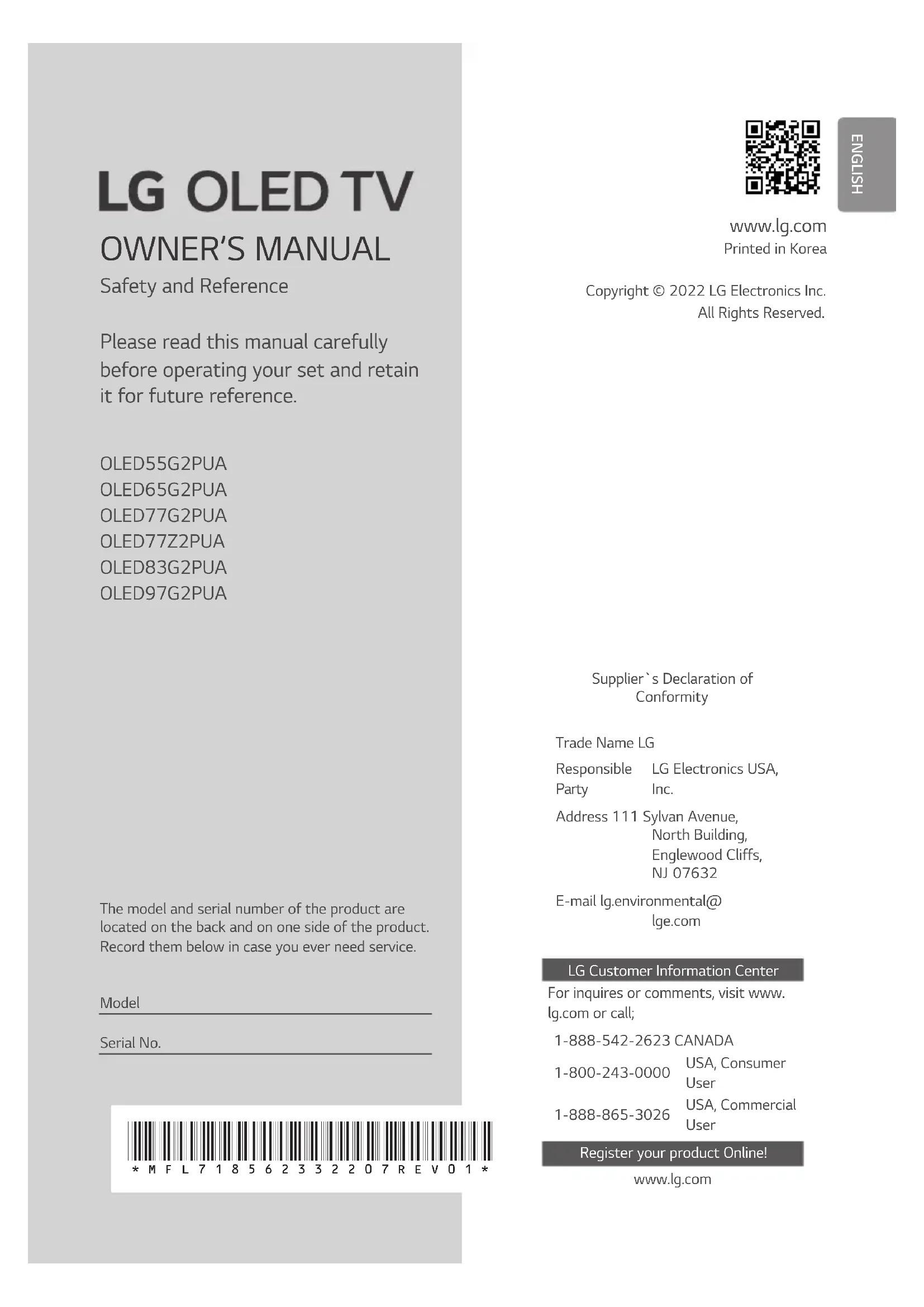Please read this manual carefully before operating your set and retain it for future reference. Printed in Korea www.lg.com Copyright © 2022 LG Electronics Inc. All Rights Reserved. The model and serial number of the product are located on the back and on one side of the product. Record them below in case you ever need service. Model Serial No.
