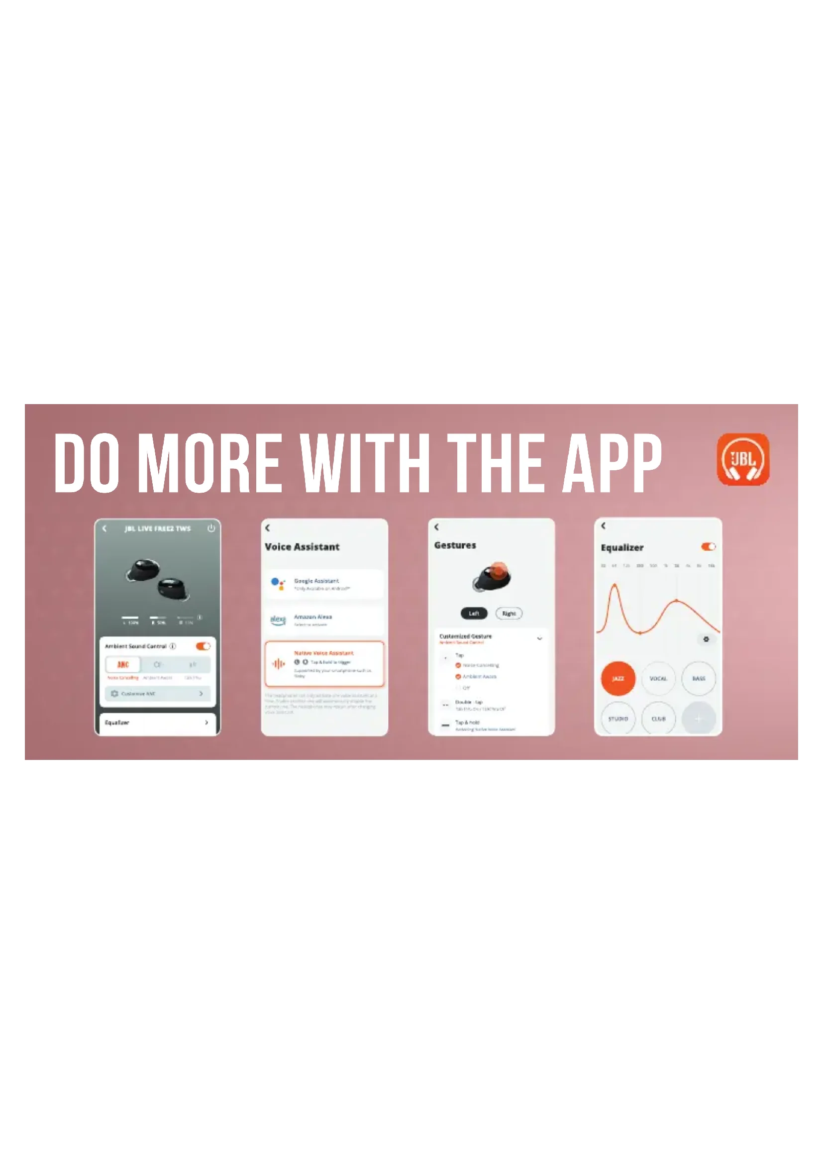 * ENABLE ADVANCE CONTROLS BY CONNECTING YOUR JBL LIVE FREE 2 TWS TO JBL HEADPHONES APP ** ENABLE YOUR VOICE ASSISTANT THROUGH JBL HEADPHONES APP AND ASSIGN IT TO YOUR PREFERRED EARBUD (L/R).