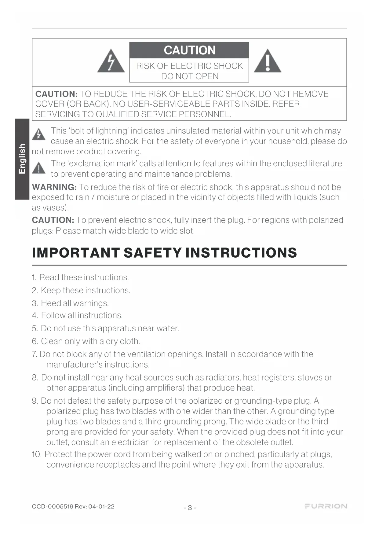 rain or moisture. Caution: Never remove the back cover of the LED TV as this can expose you to very high voltages and other hazards. If the TV does not operate properly, unplug the LED TV and call your authorized dealer or service center. Adjust only those controls that are covered in the instructions, as improper changes or modifications not expressly approved by Furrion could void the user’s warranty. Internet security caution: It is strongly recommended for security purposes to connect your TV to the Internet via a router/modem that includes router functionality. Direct connection of your TV to the Internet may expose your TV to a security threat such as extraction or tampering of content or personal information. Wireless Function of the unit (For TV with wireless function only) ● Do not operate this unit near medical equipment (pacemaker, etc.), as this may result in the malfunction of the medical equipment. ● Although this unit transmits/receives scrambled signals, be careful of unauthorized interception. We cannot be responsible for any trouble as a result. English CCD-0005519 Rev: 04-01-22 - 6 -COMPLIANCE FCC Statement Note: This equipment has been tested and found to comply with the limits for a Class B digital device, pursuant to Part 15 of the FCC Rules. These limits are designed to provide reasonable protection against harmful interference in a residential installation. This equipment generates, uses and can radiate radio frequency energy and, if not installed and used in accordance with the instructions, may cause harmful interference to radio communications. However, there is no guarantee that interference will not occur in a particular installation. If this equipment does cause harmful interference to radio or television reception, which can be determined by turning the equipment off and on, the user is encouraged to try to correct the interference by one or more of the following measures: – Reorient or relocate the receiving antenna. – Increase the separation between the equipment and receiver. – Connect the equipment into an outlet on a circuit different from that to which the receiver is connected. – Consult the dealer or an experienced radio/TV technician for help.