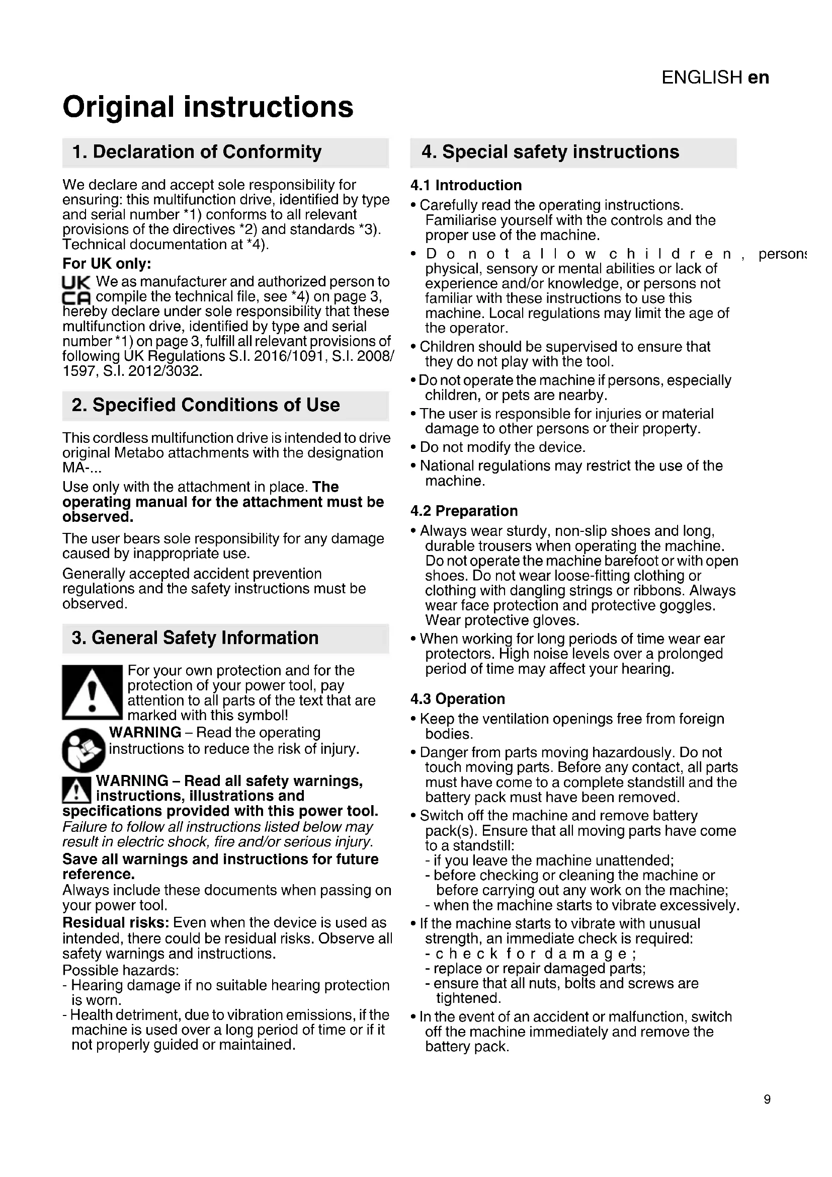 Original instructions We declare and accept sole responsibility for ensuring: this multifunction drive, identified by type and serial number *1) conforms to all relevant provisions of the directives *2) and standards *3). Technical documentation at *4). For UK only: We as manufacturer and authorized person to compile the technical file, see *4) on page 3, hereby declare under sole responsibility that these multifunction drive, identified by type and serial number *1) on page 3, fulfill all relevant provisions of following UK Regulations S.I. 2016/1091, S.I. 2008/ 1597, S.I. 2012/3032. This cordless multifunction drive is intended to drive original Metabo attachments with the designation MA-... Use only with the attachment in place. The operating manual for the attachment must be observed. The user bears sole responsibility for any damage caused by inappropriate use. Generally accepted accident prevention regulations and the safety instructions must be observed. For your own protection and for the protection of your power tool, pay attention to all parts of the text that are marked with this symbol! WARNING – Read the operating instructions to reduce the risk of injury. WARNING – Read all safety warnings, instructions, illustrations and specifications provided with this power tool. Failure to follow all instructions listed below may result in electric shock, fire and/or serious injury. Save all warnings and instructions for future reference. Always include these documents when passing on your power tool. Residual risks: Even when the device is used as intended, there could be residual risks. Observe all safety warnings and instructions. Possible hazards: - Hearing damage if no suitable hearing protection is worn. - Health detriment, due to vibration emissions, if the machine is used over a long period of time or if it not properly guided or maintained.