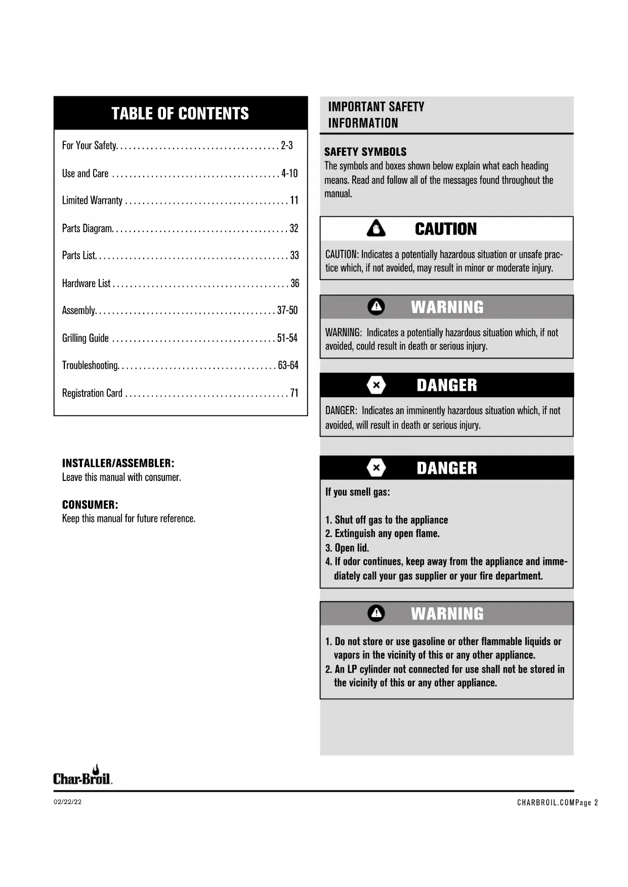 - -64 Registration Card 02/22/22CHARBROIL.COMPage 3 FOR YOUR SAFETY - INSTALLING YOUR GRILL CAUTION DANGER For residential use only. Do not use for commercial cooking. Read and follow all safety statements, assembly instructions, and use and care directions before attempting to assemble and cook. Some parts may contain sharp edges. Wear protective gloves if necessary. Grease Fires p. 71