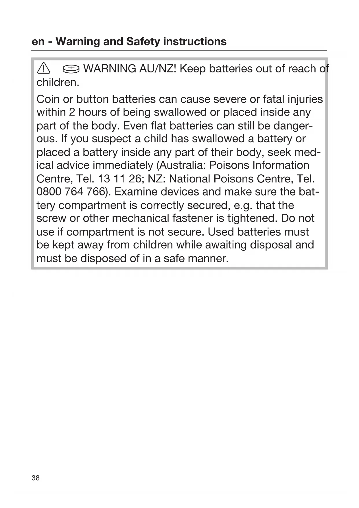 WARNING AU/NZ! Keep batteries out of reach of children. Coin or button batteries can cause severe or fatal injuries within 2 hours of being swallowed or placed inside any part of the body. Even flat batteries can still be danger- ous. If you suspect a child has swallowed a battery or placed a battery inside any part of their body, seek med- ical advice immediately (Australia: Poisons Information Centre, Tel. 13 11 26; NZ: National Poisons Centre, Tel. 0800 764 766). Examine devices and make sure the bat- tery compartment is correctly secured, e.g. that the screw or other mechanical fastener is tightened. Do not use if compartment is not secure. Used batteries must be kept away from children while awaiting disposal and must be disposed of in a safe manner.en - Warning and Safety instructions