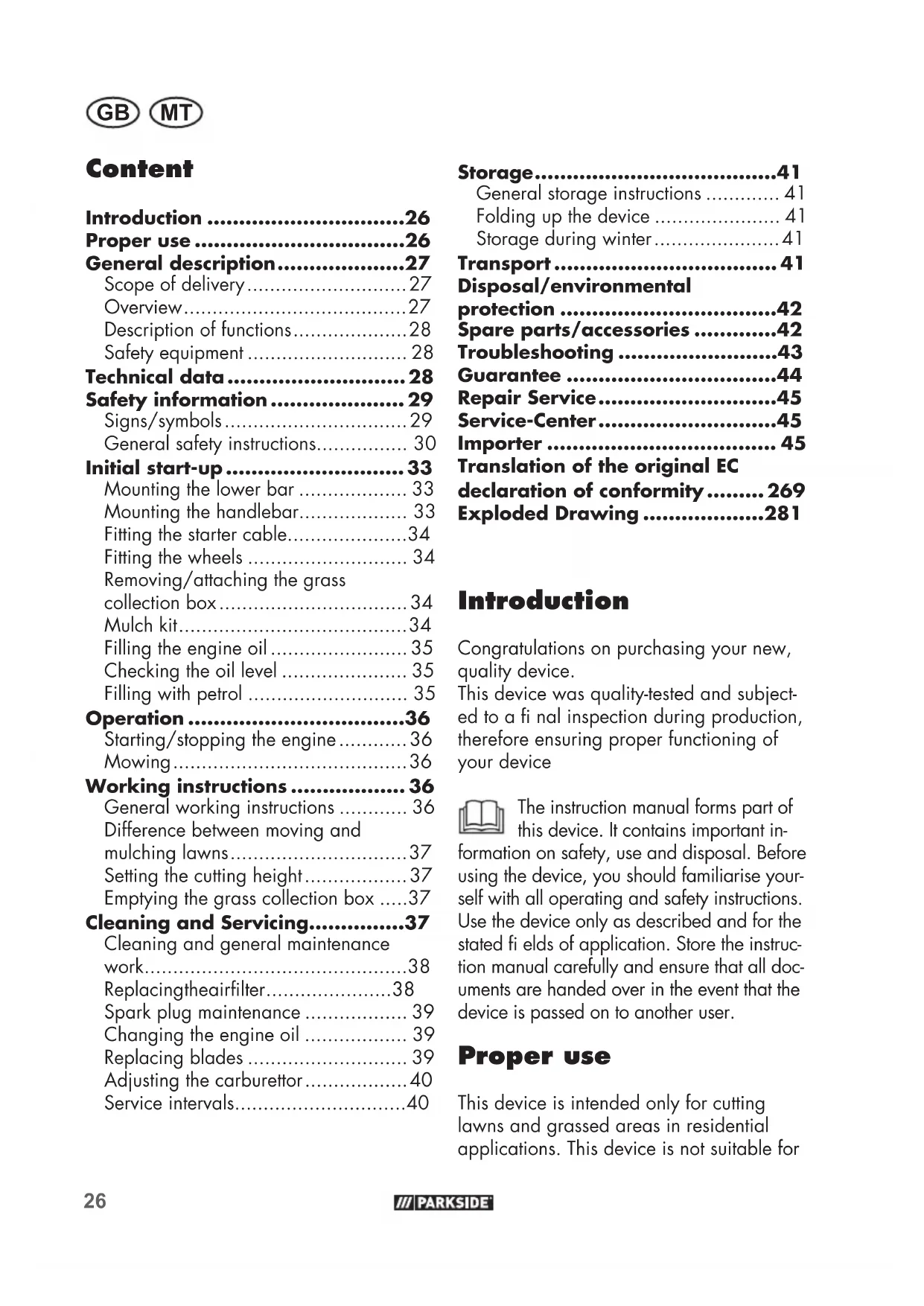 - Exploded Drawing Introduction Congratulations on purchasing your new, quality device. This device was quality-tested and subject- ed to a nal inspection during production, therefore ensuring proper functioning of your device The instruction manual forms part of this device. It contains important in- formation on safety, use and disposal. Before using the device, you should familiarise your- self with all operating and safety instructions. Use the device only as described and for the stated elds of application. Store the instruc- tion manual carefully and ensure that all doc- uments are handed over in the event that the device is passed on to another user. Proper use This device is intended only for cutting lawns and grassed areas in residential applications. This device is not suitable for27 MTGB commercial use. The warranty is void in the case of commercial use. Any other use that is not expressly permit- ted in this instruction manual may result in damage to the device and pose a serious hazard to the user. The device is intended for use by adults. Children and people who are not familiar with this instruction manual must not use the device. The operator or user is responsible for any accidents or personal injury and/or material damage to third parties or their property. General description An illustration of the most im- portant functional components can be found on the front and the back fold-out pages. Scope of delivery Carefully remove the device from the packaging and check whether all the parts listed below are present and complete: - Petrol lawnmower - 2x Lower bar - Mounting accessories for the handlebar - Grass collection box - Cable clamp - Spark plug wrench - Mulch kit - Screwdriver - Quick guide - Instruction manual The supplied screwdriver can be used as both a fl at-head and a Phillips-head screwdriver. You can change the screw variant by reinserting the han- dle. Overview 1 Handlebar 2 Safety bracket 3 Mounting accessories, handlebar 4 Lower bar 5 Grass collection box 6 Impact protection 7 Tank cover 8 Filler plugs 9 Air lter box 10 Air lter (not visible) 11 Petrol pump (primer) 12 Lawn mower housing 13 Wheels 14 Machine handle 15 Exhaust guard 16 Spark plug connector 17 Spark plug (not visible) 18 Engine cover with ventilation holes ( nger protection) 19 Bowden cable 20 Cable clamp 21 Starter cable guide 22 Starter handle with starter cable 23 Spark plug wrench 24 Mulch kit 25 Screwdriver 4a Phillips screw 3a Knurled nut 3b Washer 3c Screw 26 Attachment for grass collection box 5a Carrying handle 27 Oil tank cap with dipstick 28 Cutting height position28 MTGB 13a Wheel bolt 13b Safety washer 29 Blade 30 Blade bolt 31 Motor spindle 32 Clamping disk 33 Oil drain screw Description of functions The device is powered by a powerful 4-stroke engine (Zongshen 132cc Easy Start). The device is equipped with a robust plas- tic housing, a grass collection box and a foldable grip handle. Please refer to the descriptions below for information on how the operating elements work. Safety equipment 2 Safety bracket The device stops when the safety brack- et is released. 15 Exhaust guard Prevents hands or fl ammable materials from coming into contact with the hot exhaust. 6 Impact protection Protects the operator from ejected parts and against unintended contact with the blade when mowing without the grass collection box. Technical data Petrol Lawnmower PBM 132 B1 Engine p. 281