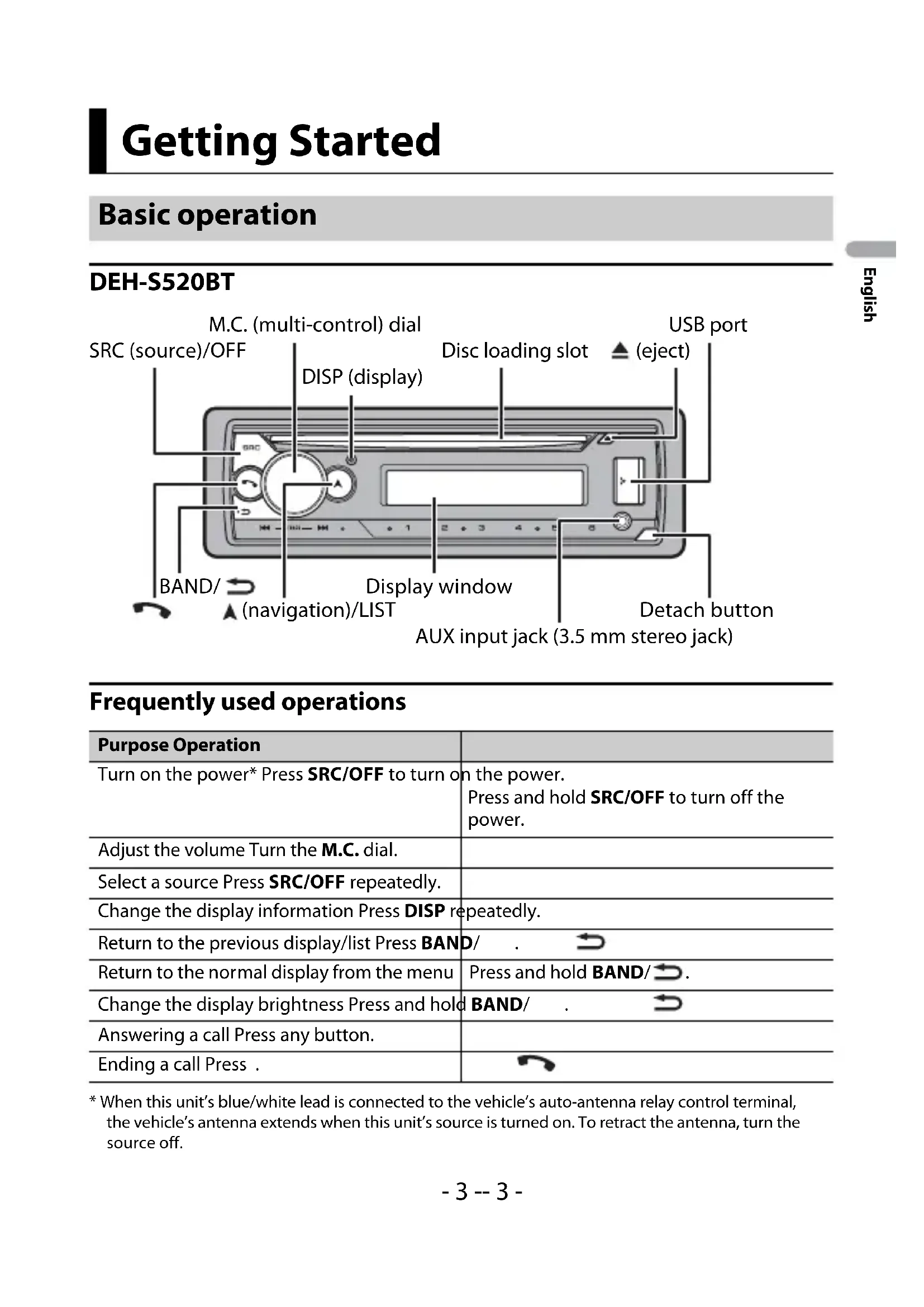 - In the following instructions, a USB memory or USB audio player are referred to as “USB device”. Table of Contents- 3 -- 3 - English DEH-S520BT Frequently used operations