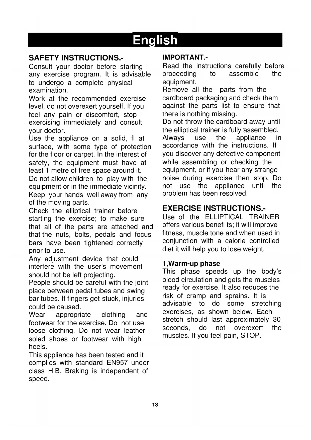 English SAFETY INSTRUCTIONS.- Consult your doctor before starting any exercise program. It is advisable to undergo a complete physical examination. Work at the recommended exercise level, do not overexert yourself. If you feel any pain or discomfort, stop exercising immediately and consult your doctor. Use the appliance on a solid, fl at surface, with some type of protection for the floor or carpet. In the interest of safety, the equipment must have at least 1 metre of free space around it. Do not allow children to play with the equipment or in the immediate vicinity. Keep your hands well away from any of the moving parts. Check the elliptical trainer before starting the exercise; to make sure that all of the parts are attached and that the nuts, bolts, pedals and focus bars have been tightened correctly prior to use. Any adjustment device that could interfere with the user’s movement should not be left projecting. People should be careful with the joint place between pedal tubes and swing bar tubes. If fingers get stuck, injuries could be caused. Wear appropriate clothing and footwear for the exercise. Do not use loose clothing. Do not wear leather soled shoes or footwear with high heels. This appliance has been tested and it complies with standard EN957 under class H.B. Braking is independent of speed. IMPORTANT.- Read the instructions carefully before proceeding to assemble the equipment. Remove all the parts from the cardboard packaging and check them against the parts list to ensure that there is nothing missing. Do not throw the cardboard away until the elliptical trainer is fully assembled. Always use the appliance in accordance with the instructions. If you discover any defective component while assembling or checking the equipment, or if you hear any strange noise during exercise then stop. Do not use the appliance until the problem has been resolved. EXERCISE INSTRUCTIONS.- Use of the ELLIPTICAL TRAINER offers various benefi ts; it will improve fitness, muscle tone and when used in conjunction with a calorie controlled diet it will help you to lose weight. 1,Warm-up phase This phase speeds up the body’s blood circulation and gets the muscles ready for exercise. It also reduces the risk of cramp and sprains. It is advisable to do some stretching exercises, as shown below. Each stretch should last approximately 30 seconds, do not overexert the muscles. If you feel pain, STOP.14