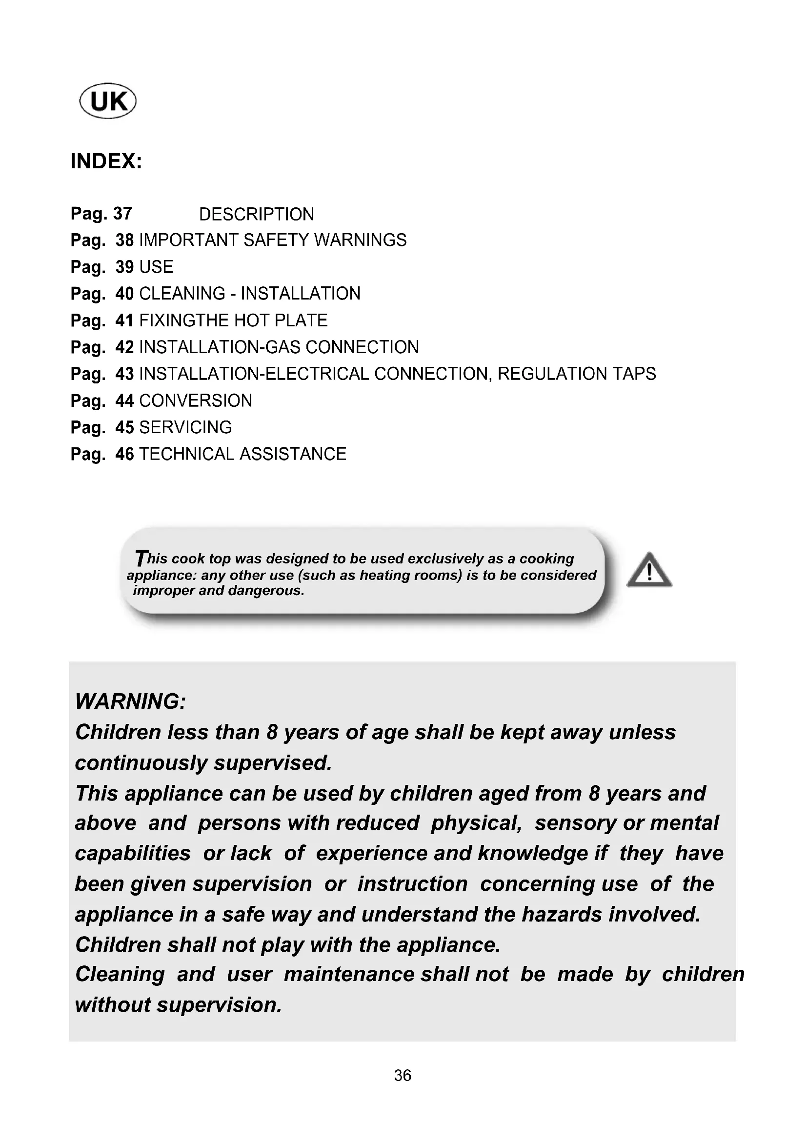 This cook top was designed to be used exclusively as a cooking appliance: any other use (such as heating rooms) is to be considered improper and dangerous.