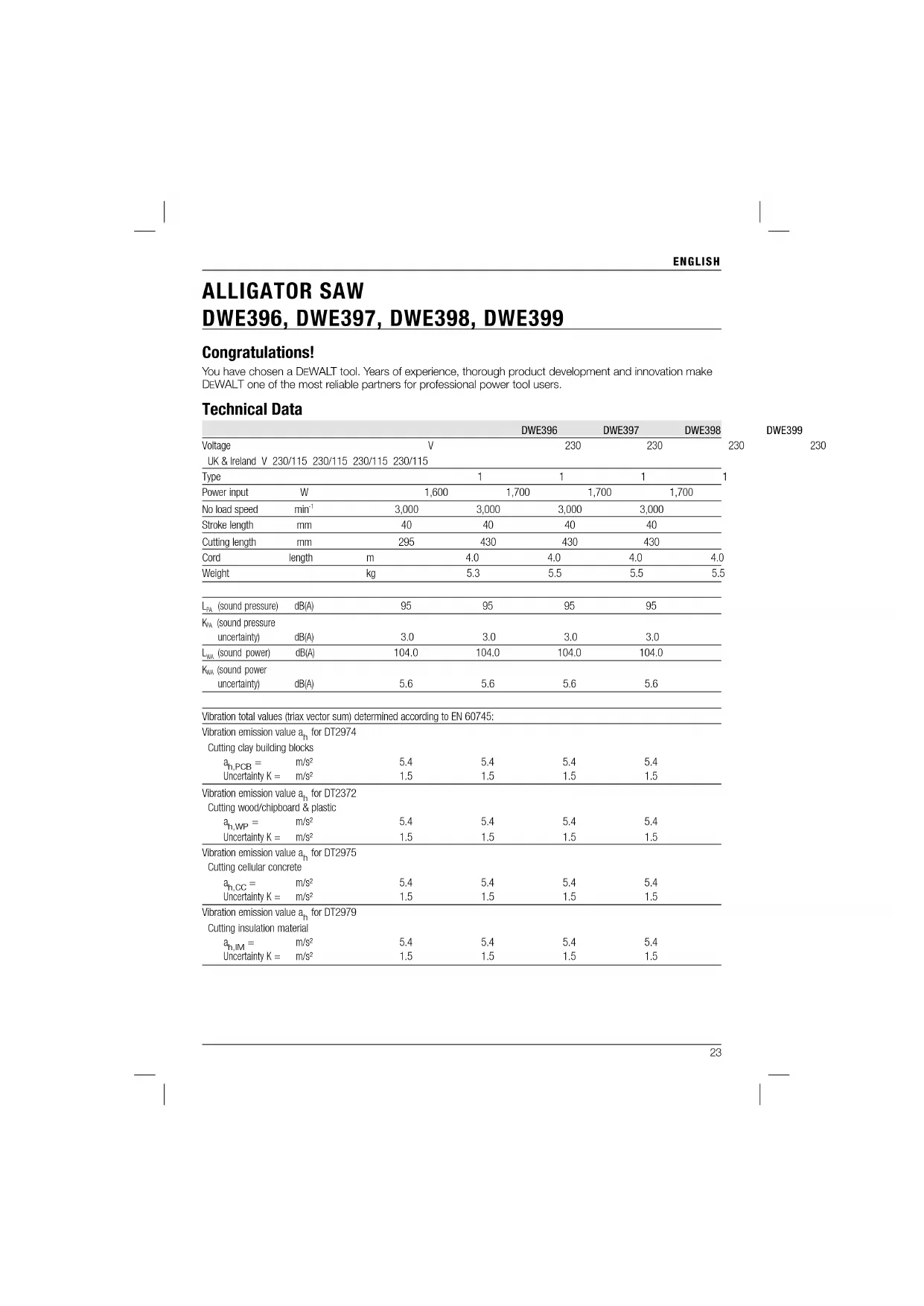 EWALT one of the most reliable partners for professional power tool users. Technical Data