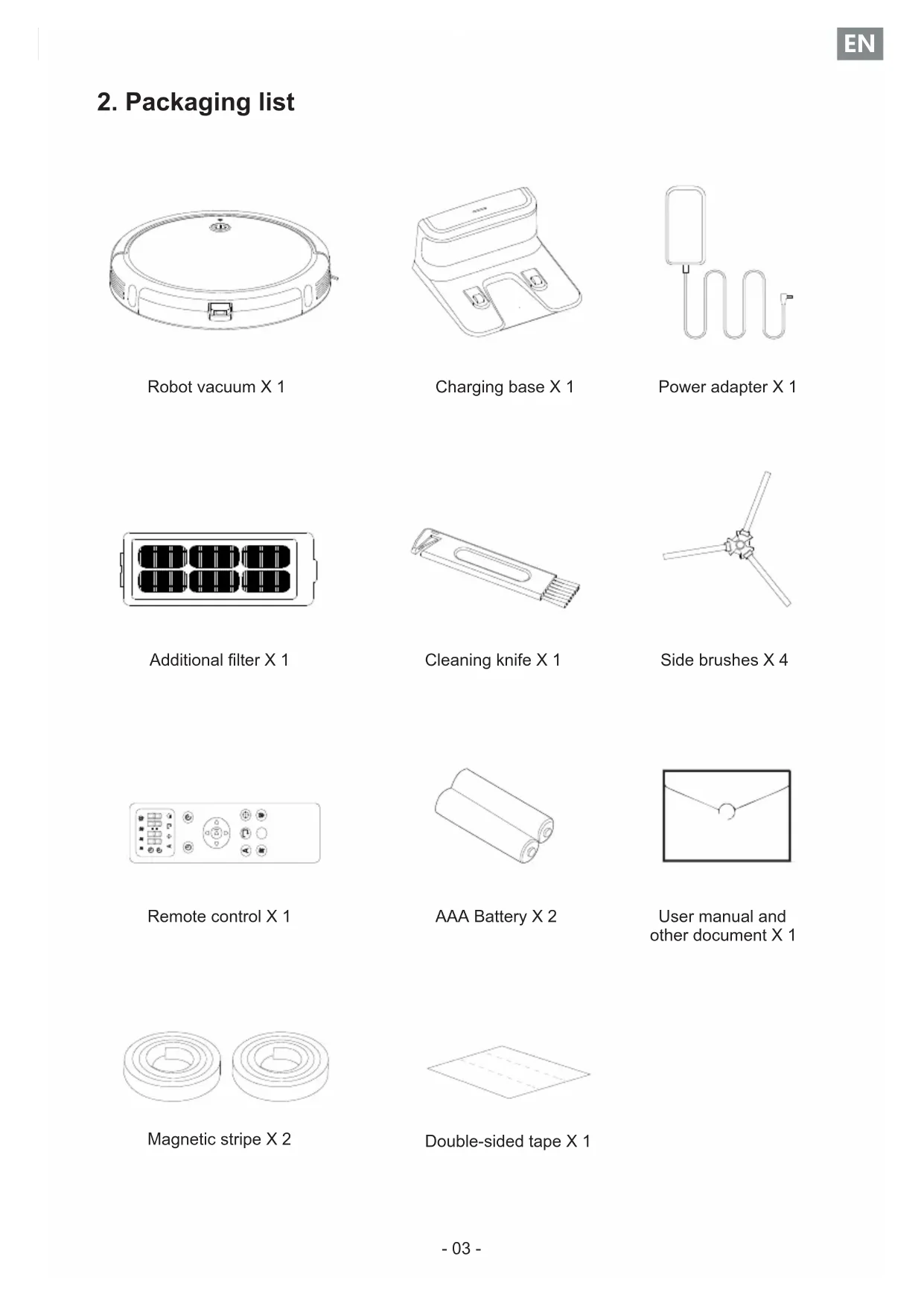 Robot vacuum X 1 Charging base X 1 Power adapter X 1 Additional filter X 1 Cleaning knife X 1 Side brushes X 4 Remote control X 1 AAA Battery X 2 User manual and other document X 1 Magnetic stripe X 2 Double-sided tape X 1- 04 -