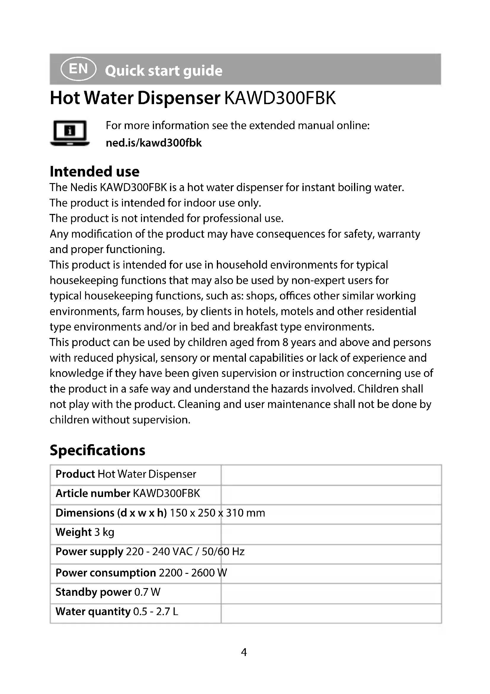 Quick start guide Hot Water Dispenser KAWD300FBK For more information see the extended manual online: ned.is/kawd300fbk Intended use The Nedis KAWD300FBK is a hot water dispenser for instant boiling water. The product is intended for indoor use only. The product is not intended for professional use. Any modication of the product may have consequences for safety, warranty and proper functioning. This product is intended for use in household environments for typical housekeeping functions that may also be used by non-expert users for typical housekeeping functions, such as: shops, oces other similar working environments, farm houses, by clients in hotels, motels and other residential type environments and/or in bed and breakfast type environments. This product can be used by children aged from 8 years and above and persons with reduced physical, sensory or mental capabilities or lack of experience and knowledge if they have been given supervision or instruction concerning use of the product in a safe way and understand the hazards involved. Children shall not play with the product. Cleaning and user maintenance shall not be done by children without supervision. Specications Product Hot Water Dispenser Article number KAWD300FBK Dimensions (d x w x h) 150 x 250 x 310 mm Weight 3 kg Power supply 220 - 240 VAC / 50/60 Hz Power consumption 2200 - 2600 W Standby power 0.7 W Water quantity 0.5 - 2.7 L KAWD300FBK_MAN_COMP_0520_print_(20160 1422)_v00.01.indd 4KAWD300FBK_MAN_COMP_0520_print_(20160 1422)_v00.01.indd 4 03-06-2020 08:2703-06-2020 08:275 Main parts (image A)