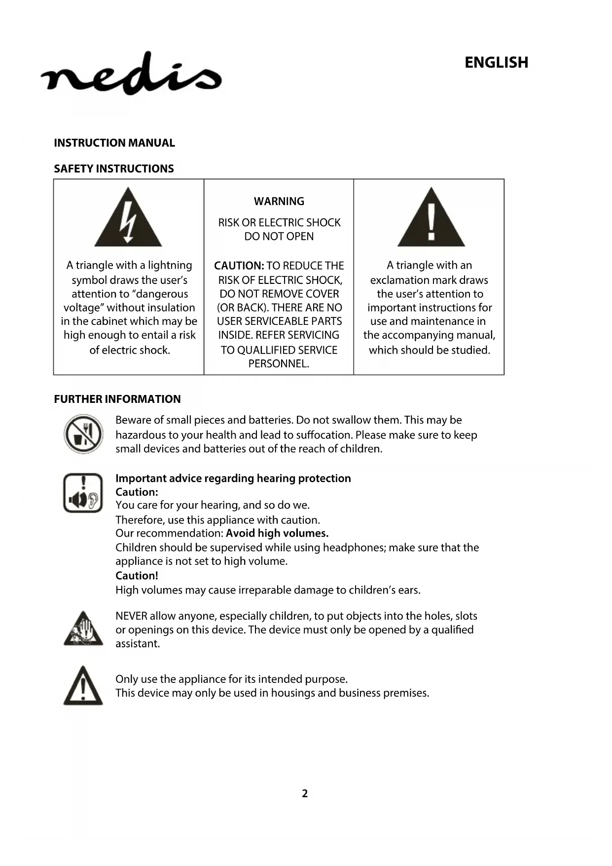 Safety precautions: To reduce risk of electric shock, this product should ONLY be opened by an authorized technician when service is required. Disconnect the product from mains and other equipment if a problem should occur. Do not expose the product to water or moisture. Maintenance: Clean only with a dry cloth. Do not use cleaning solvents or abrasives. Warranty: No guarantee or liability can be accepted for any changes and modications of the product or damage caused due to incorrect use of this product. General: Designs and specications are subject to change without notice. All logos, brands and product names are trademarks or registered trademarks of their respective holders and are hereby recognized as such. Keep this manual and packaging for future reference. Attention: This product is marked with this symbol. It means that used electrical and electronic products should not be mixed with general household waste. There is a separate collections system for these products. This product has been manufactured and supplied in compliance with all relevant regulations and directives, valid for all member states of the European Union. It also complies to all applicable specications and regulations in the country of sales. Formal documentation is available upon request. This includes, but is not limited to: Declaration of Conformity (and product identity), Material Safety Data Sheet, product test report. Please contact our customer service desk for support: via website: http://www.nedis.com/en-us/contact/contact-form.htm via e-mail: service@nedis.com via telephone: +31 (0)73-5993965 (during oce hours) NEDIS B.V., De Tweeling 28, 5215 MC ’s-Hertogenbosch, THE NETHERLANDS10 DEUTSCH BEDIENUNGSANLEITUNG SICHERHEITSANWEISUNGEN WARNUNG GEFAHR EINES STROMSCHLAGS NICHT ÖFFNEN Der Blitz im gleichseitigen Dreieck weist auf gefährliche Hochspannung im Gerät hin, die zu Stromschlag führen kann. VORSICHT: ZUR VERMEIDUNG VON STROMSCHLAG