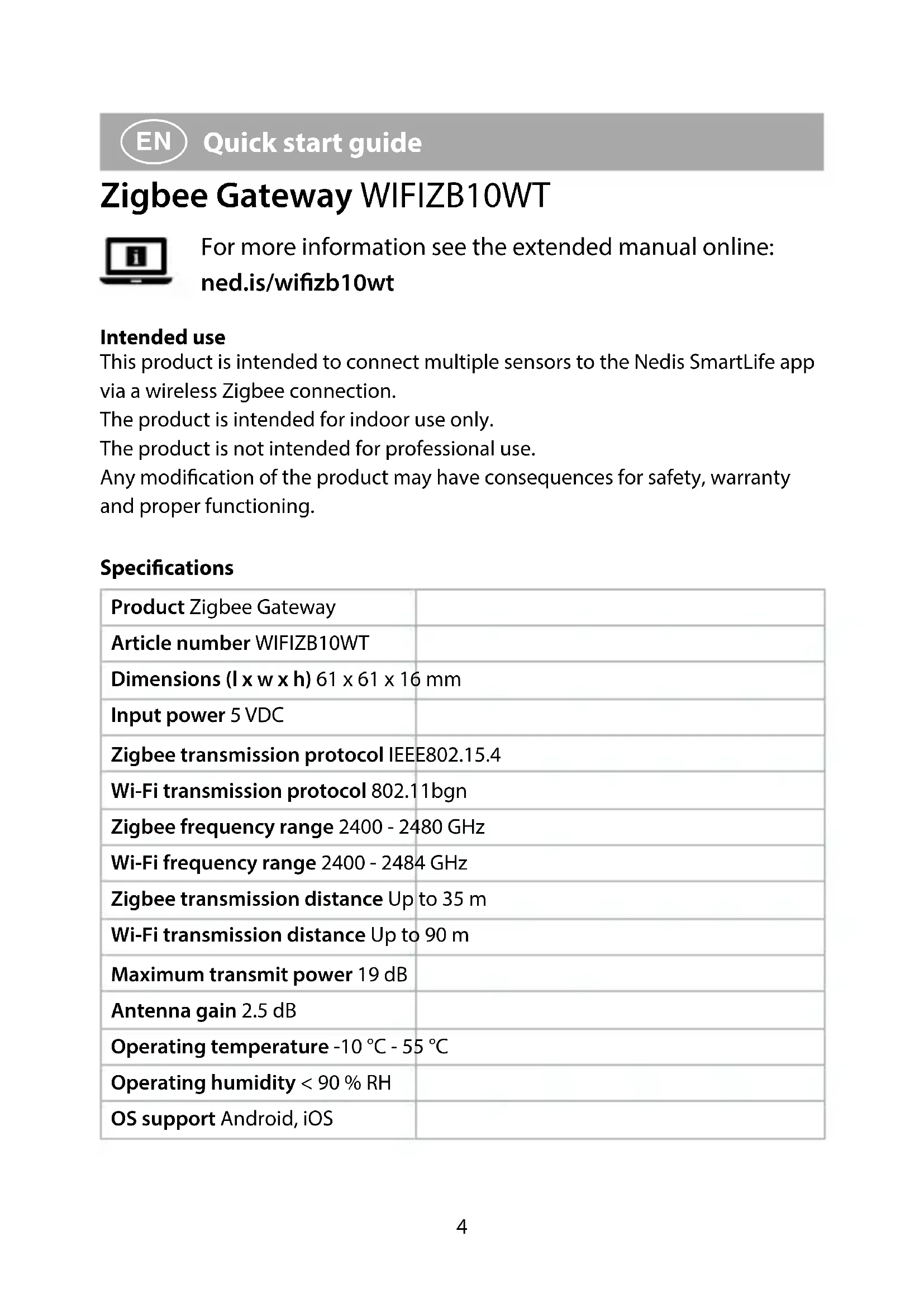 Quick start guide Zigbee Gateway WIFIZB10WT For more information see the extended manual online: ned.is/wizb10wt Intended use This product is intended to connect multiple sensors to the Nedis SmartLife app via a wireless Zigbee connection. The product is intended for indoor use only. The product is not intended for professional use. Any modication of the product may have consequences for safety, warranty and proper functioning. Specications Product Zigbee Gateway Article number WIFIZB10WT Dimensions (l x w x h) 61 x 61 x 16 mm Input power 5 VDC Zigbee transmission protocol IEEE802.15.4 Wi-Fi transmission protocol 802.11bgn Zigbee frequency range 2400 - 2480 GHz Wi-Fi frequency range 2400 - 2484 GHz Zigbee transmission distance Up to 35 m Wi-Fi transmission distance Up to 90 m Maximum transmit power 19 dB Antenna gain 2.5 dB Operating temperature -10 °C - 55 °C Operating humidity < 90 % RH OS support Android, iOS5 Main parts (image A)