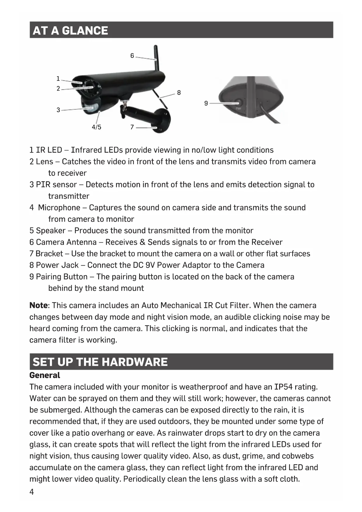 General The camera included with your monitor is weatherproof and have an IP54 rating. Water can be sprayed on them and they will still work; however, the cameras cannot be submerged. Although the cameras can be exposed directly to the rain, it is recommended that, if they are used outdoors, they be mounted under some type of cover like a patio overhang or eave. As rainwater drops start to dry on the camera glass, it can create spots that will reflect the light from the infrared LEDs used for night vision, thus causing lower quality video. Also, as dust, grime, and cobwebs accumulate on the camera glass, they can reflect light from the infrared LED and might lower video quality. Periodically clean the lens glass with a soft cloth.