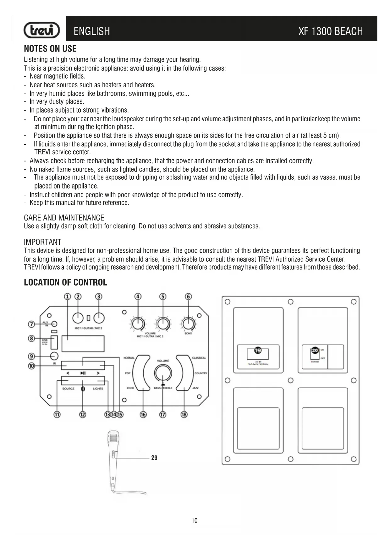 Use a slightly damp soft cloth for cleaning. Do not use solvents and abrasive substances. IMPORTANT This device is designed for non-professional home use. The good construction of this device guarantees its perfect functioning for a long time. If, however, a problem should arise, it is advisable to consult the nearest TREVI Authorized Service Center. TREVI follows a policy of ongoing research and development. Therefore products may have different features from those described.