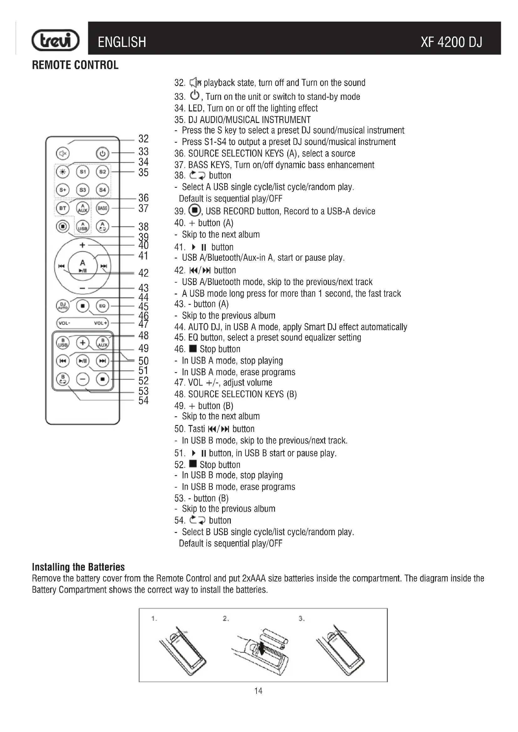 Installing the Batteries Remove the battery cover from the Remote Control and put 2xAAA size batteries inside the compartment. The diagram inside the Battery Compartment shows the correct way to install the batteries.15 XF 4200 DJENGLISH TRANSPORTATION For transportation use the two side handles placed the device or the two top handles, slightly bend the device and exploit the two rear wheels. POWER This unit works with power supply 230V 50Hz. To activate the unit, insert the power cord into the socket on the device (31) and plug into a power outlet. Do not connect the appliance to electrical outlets other than those indicated. BASIC FUNCTIONS POWER ON