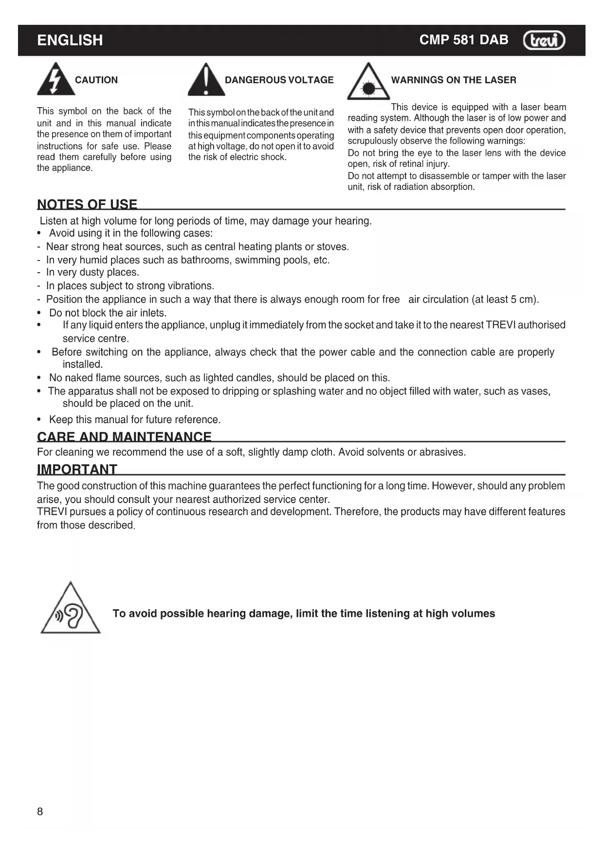 This device is equipped with a laser beam reading system. Although the laser is of low power and with a safety device that prevents open door operation, scrupulously observe the following warnings: Do not bring the eye to the laser lens with the device open, risk of retinal injury. Do not attempt to disassemble or tamper with the laser unit, risk of radiation absorption.9 CMP 581 DAB ENGLISH