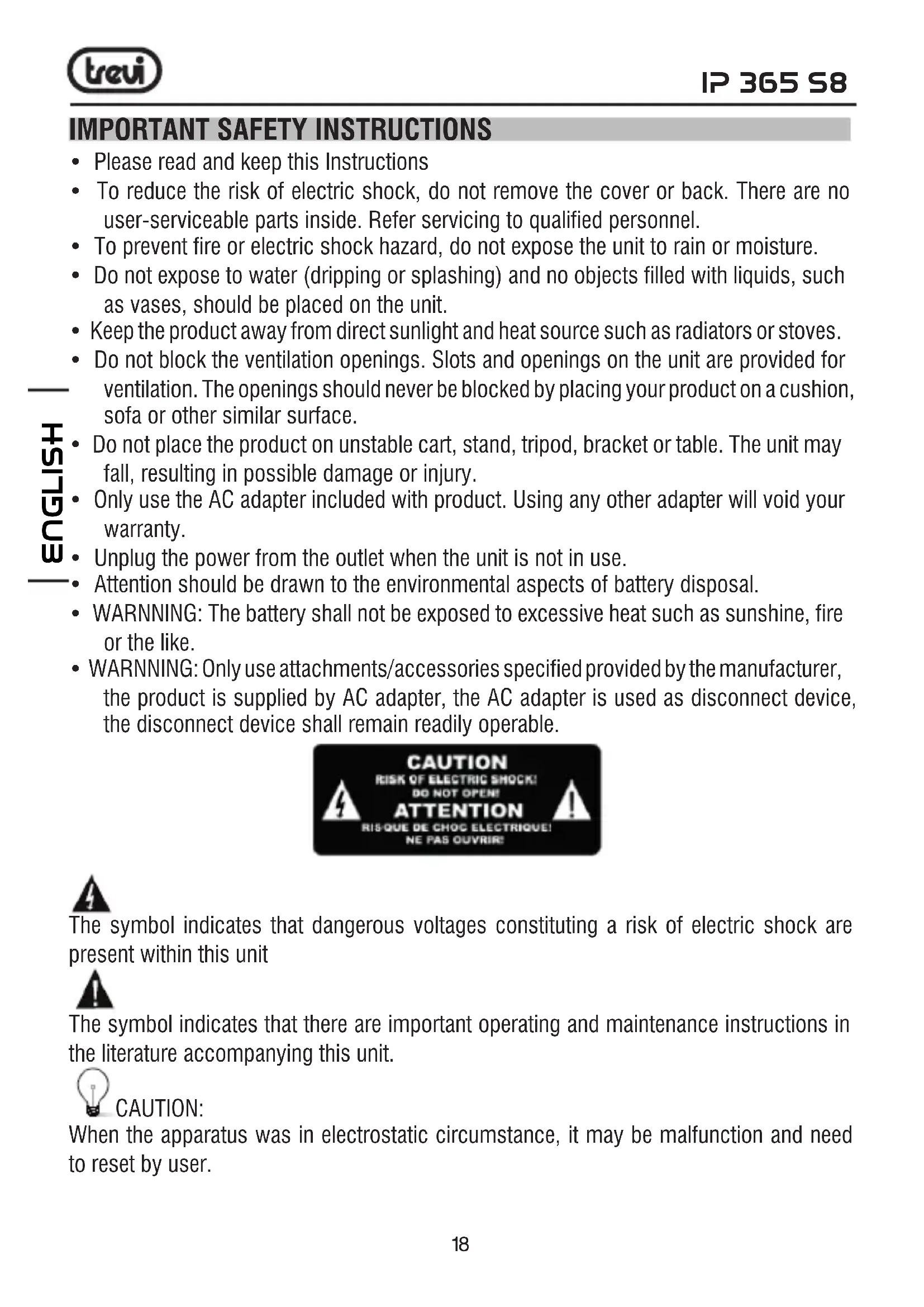 - WARNNING: Only use attachments/accessories specified provided by the manufacturer, the product is supplied by AC adapter, the AC adapter is used as disconnect device, the disconnect device shall remain readily operable. The symbol indicates that dangerous voltages constituting a risk of electric shock are present within this unit The symbol indicates that there are important operating and maintenance instructions in the literature accompanying this unit. CAUTION: When the apparatus was in electrostatic circumstance, it may be malfunction and need to reset by user. ENGLISH19 IP 365 S8