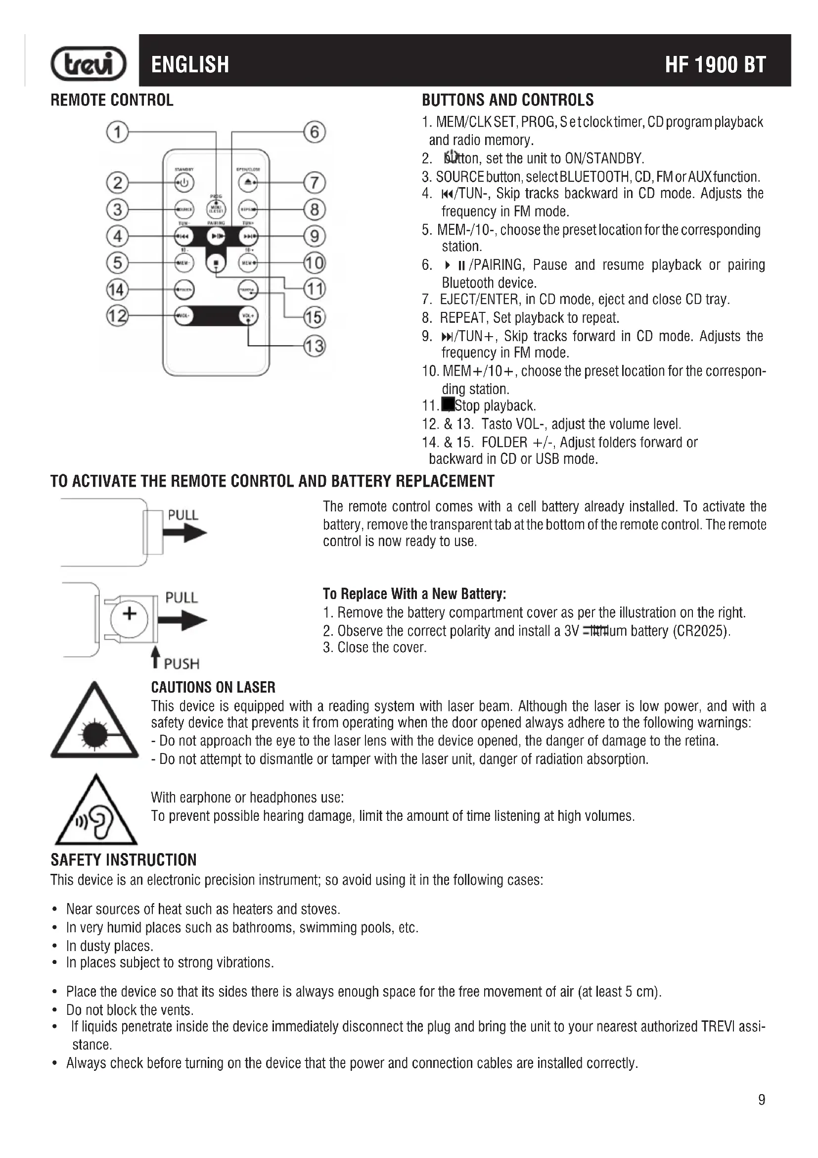 This device is equipped with a reading system with laser beam. Although the laser is low power, and with a safety device that prevents it from operating when the door opened always adhere to the following warnings: - Do not approach the eye to the laser lens with the device opened, the danger of damage to the retina. - Do not attempt to dismantle or tamper with the laser unit, danger of radiation absorption. TO ACTIVATE THE REMOTE CONRTOL AND BATTERY REPLACEMENT The remote control comes with a cell battery already installed. To activate the battery, remove the transparent tab at the bottom of the remote control. The remote control is now ready to use. To Replace With a New Battery: