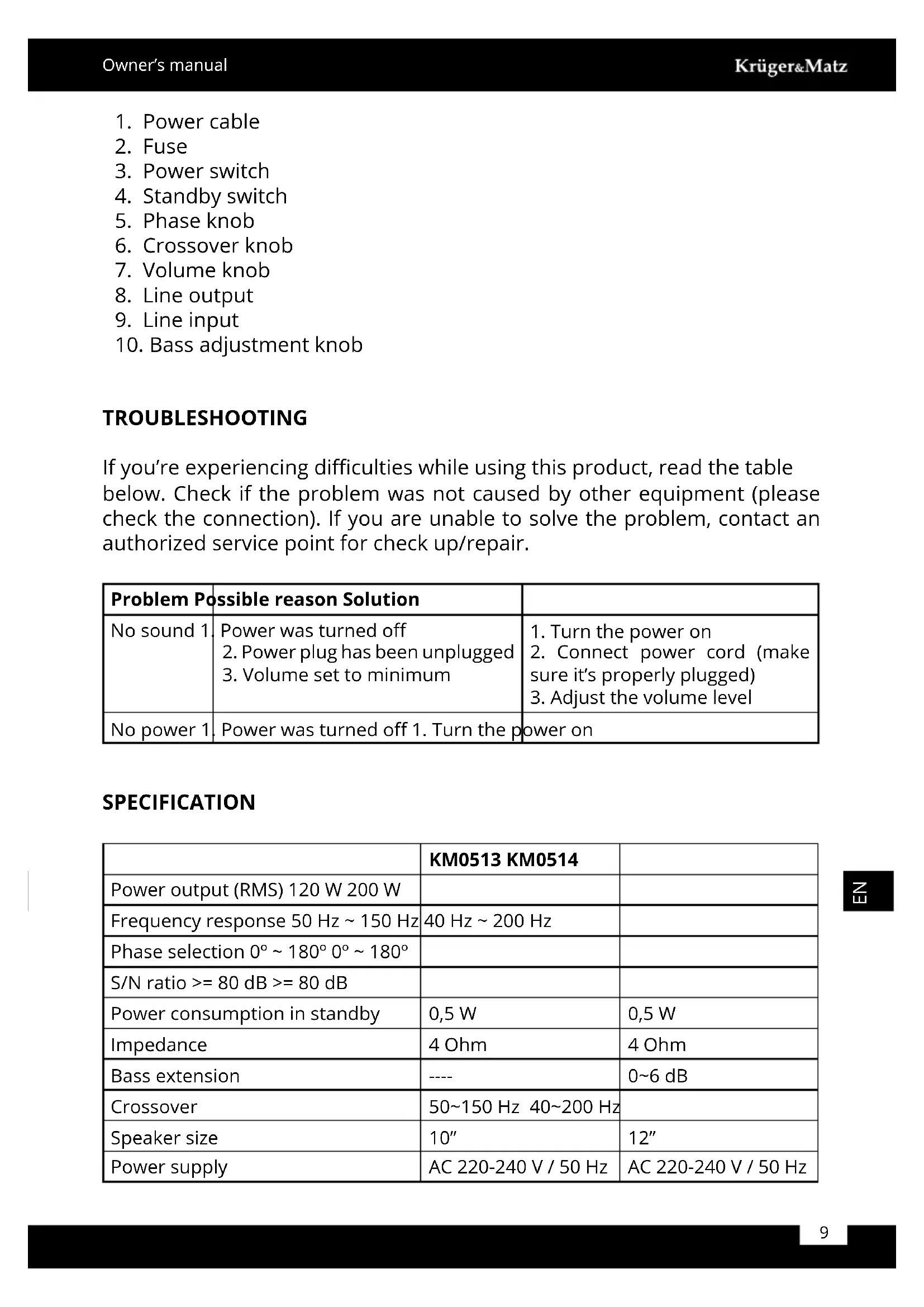 KM0514 - Subwoofer Krüger&Matz - Free user manual and instructions