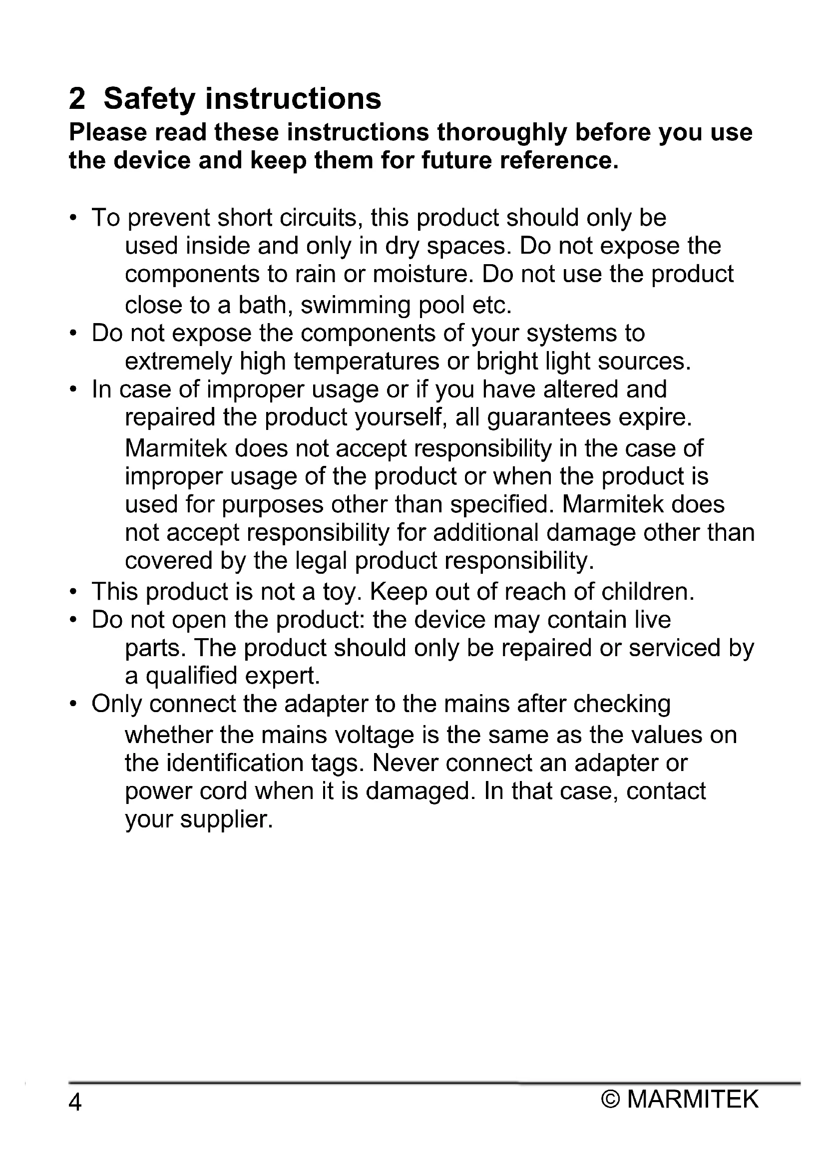 - In case of improper usage or if you have altered and repaired the product yourself, all guarantees expire. Marmitek does not accept responsibility in the case of improper usage of the product or when the product is used for purposes other than specified. Marmitek does not accept responsibility for additional damage other than covered by the legal product responsibility.