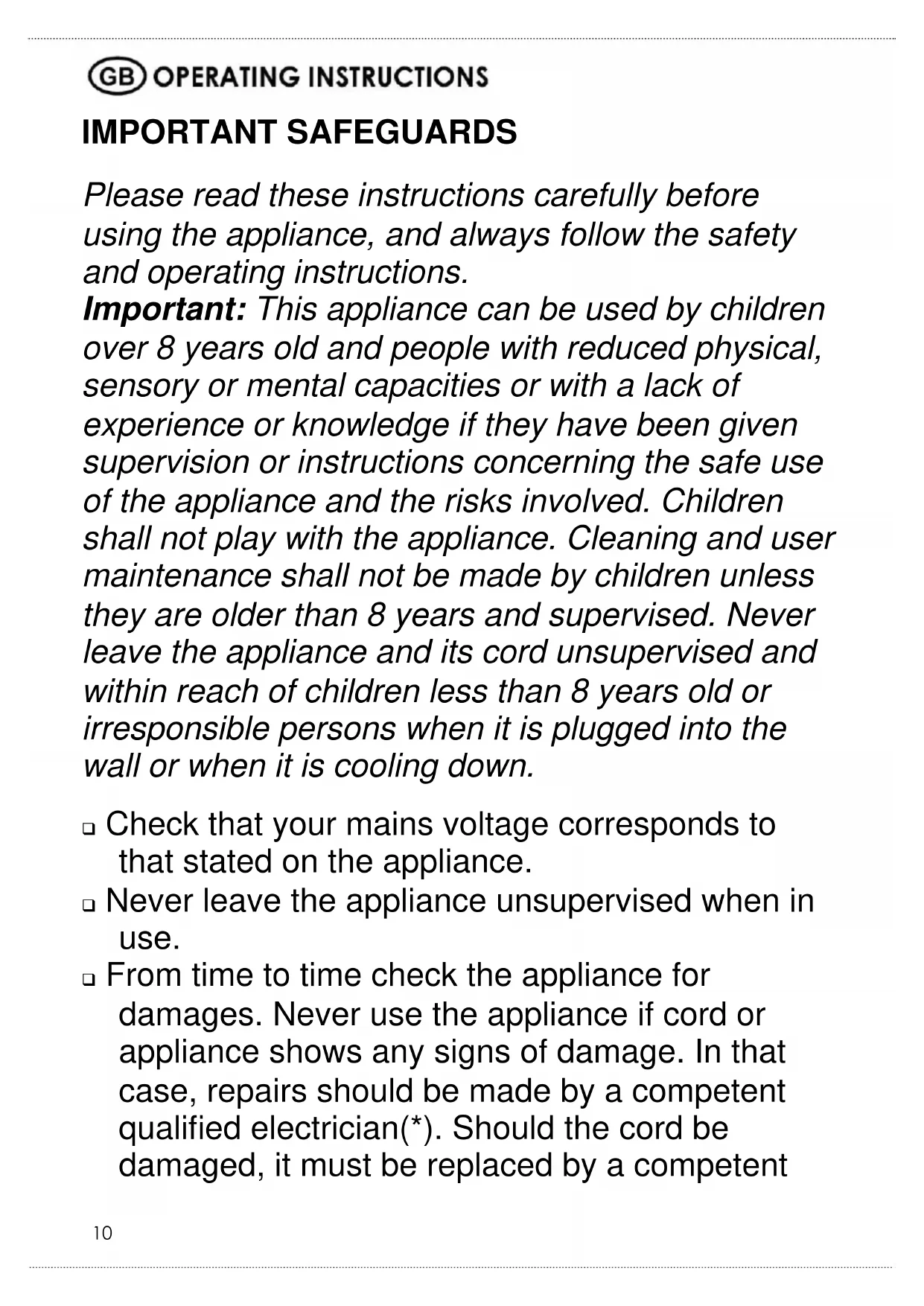 Important: This appliance can be used by children over 8 years old and people with reduced physical, sensory or mental capacities or with a lack of experience or knowledge if they have been given supervision or instructions concerning the safe use of the appliance and the risks involved. Children shall not play with the appliance. Cleaning and user maintenance shall not be made by children unless they are older than 8 years and supervised. Never leave the appliance and its cord unsupervised and within reach of children less than 8 years old or irresponsible persons when it is plugged into the wall or when it is cooling down.