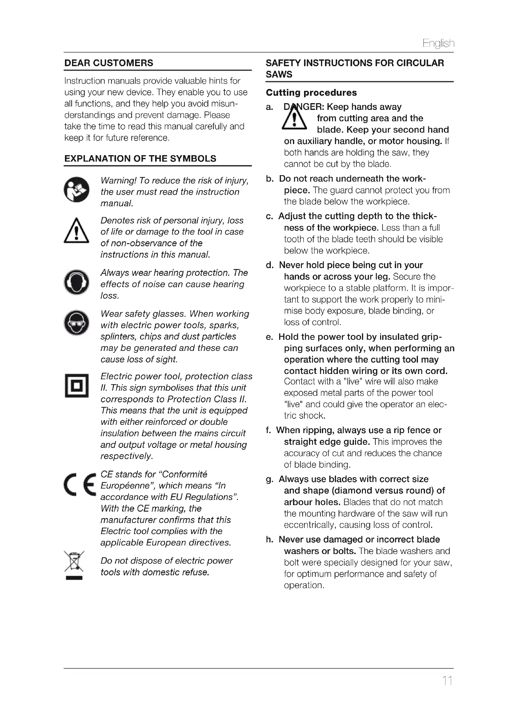 SAWS Cutting procedures a. DANGER: Keep hands away from cutting area and the blade. Keep your second hand on auxiliary handle, or motor housing. If both hands are holding the saw, they cannot be cut by the blade. b. Do not reach underneath the work- piece. The guard cannot protect you from the blade below the workpiece. c. Adjust the cutting depth to the thick- ness of the workpiece. Less than a full tooth of the blade teeth should be visible below the workpiece. d. Never hold piece being cut in your hands or across your leg. Secure the workpiece to a stable platform. It is impor- tant to support the work properly to mini- mise body exposure, blade binding, or loss of control. e. Hold the power tool by insulated grip- ping surfaces only, when performing an operation where the cutting tool may contact hidden wiring or its own cord. Contact with a "live" wire will also make exposed metal parts of the power tool "live" and could give the operator an elec- tric shock. f. When ripping, always use a rip fence or straight edge guide. This improves the accuracy of cut and reduces the chance of blade binding. g. Always use blades with correct size and shape (diamond versus round) of arbour holes. Blades that do not match the mounting hardware of the saw will run eccentrically, causing loss of control. h. Never use damaged or incorrect blade washers or bolts. The blade washers and bolt were specially designed for your saw, for optimum performance and safety of operation.English