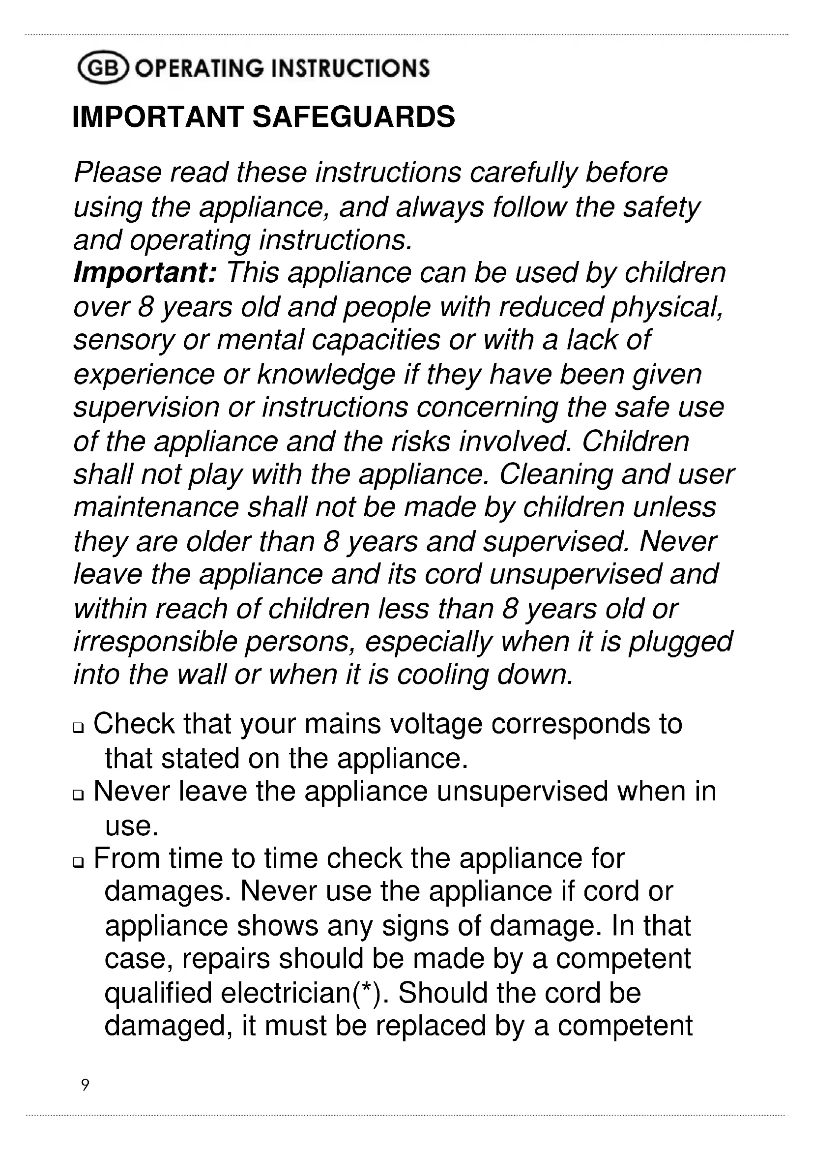 IMPORTANT SAFEGUARDS Please read these instructions carefully before using the appliance, and always follow the safety and operating instructions. Important: This appliance can be used by children over 8 years old and people with reduced physical, sensory or mental capacities or with a lack of experience or knowledge if they have been given supervision or instructions concerning the safe use of the appliance and the risks involved. Children shall not play with the appliance. Cleaning and user maintenance shall not be made by children unless they are older than 8 years and supervised. Never leave the appliance and its cord unsupervised and within reach of children less than 8 years old or irresponsible persons, especially when it is plugged into the wall or when it is cooling down. Check that your mains voltage corresponds to that stated on the appliance. Never leave the appliance unsupervised when in use. From time to time check the appliance for damages. Never use the appliance if cord or appliance shows any signs of damage. In that case, repairs should be made by a competent qualified electrician(*). Should the cord be damaged, it must be replaced by a competent Copies of the I/B. Please reproduce them without any changes except under special instruction from Team International BELGIUM. The pages must be reproduced and folded in order to obtain a booklet A5 (+/- 148.5 mm width x 210 mm height). When folding, make sure you keep the good numbering when you turn the pages of the I/B. Don’t change the page numbering. Keep the language integrity.