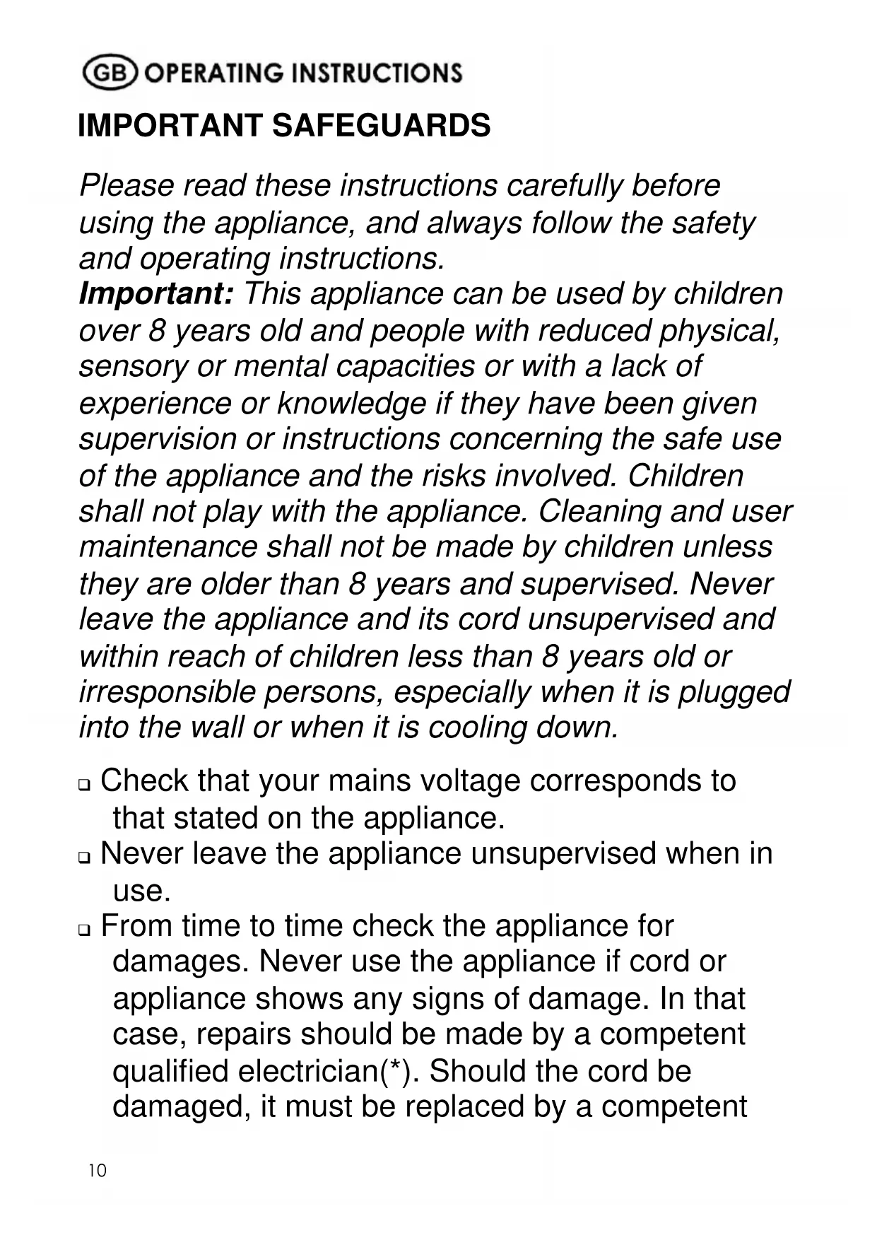 IMPORTANT SAFEGUARDS Please read these instructions carefully before using the appliance, and always follow the safety and operating instructions. Important: This appliance can be used by children over 8 years old and people with reduced physical, sensory or mental capacities or with a lack of experience or knowledge if they have been given supervision or instructions concerning the safe use of the appliance and the risks involved. Children shall not play with the appliance. Cleaning and user maintenance shall not be made by children unless they are older than 8 years and supervised. Never leave the appliance and its cord unsupervised and within reach of children less than 8 years old or irresponsible persons, especially when it is plugged into the wall or when it is cooling down. Check that your mains voltage corresponds to that stated on the appliance. Never leave the appliance unsupervised when in use. From time to time check the appliance for damages. Never use the appliance if cord or appliance shows any signs of damage. In that case, repairs should be made by a competent qualified electrician(*). Should the cord be damaged, it must be replaced by a competent11