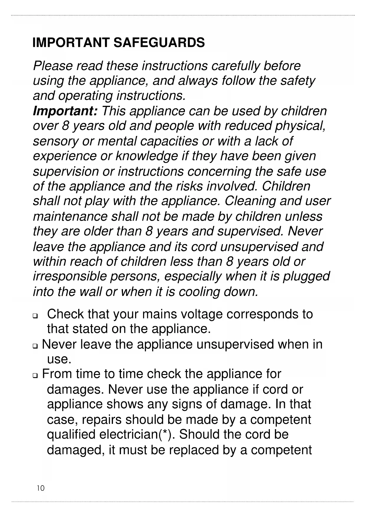 IMPORTANT SAFEGUARDS Please read these instructions carefully before using the appliance, and always follow the safety and operating instructions. Important: This appliance can be used by children over 8 years old and people with reduced physical, sensory or mental capacities or with a lack of experience or knowledge if they have been given supervision or instructions concerning the safe use of the appliance and the risks involved. Children shall not play with the appliance. Cleaning and user maintenance shall not be made by children unless they are older than 8 years and supervised. Never leave the appliance and its cord unsupervised and within reach of children less than 8 years old or irresponsible persons, especially when it is plugged into the wall or when it is cooling down. Check that your mains voltage corresponds to that stated on the appliance. Never leave the appliance unsupervised when in use. From time to time check the appliance for damages. Never use the appliance if cord or appliance shows any signs of damage. In that case, repairs should be made by a competent qualified electrician(*). Should the cord be damaged, it must be replaced by a competent11