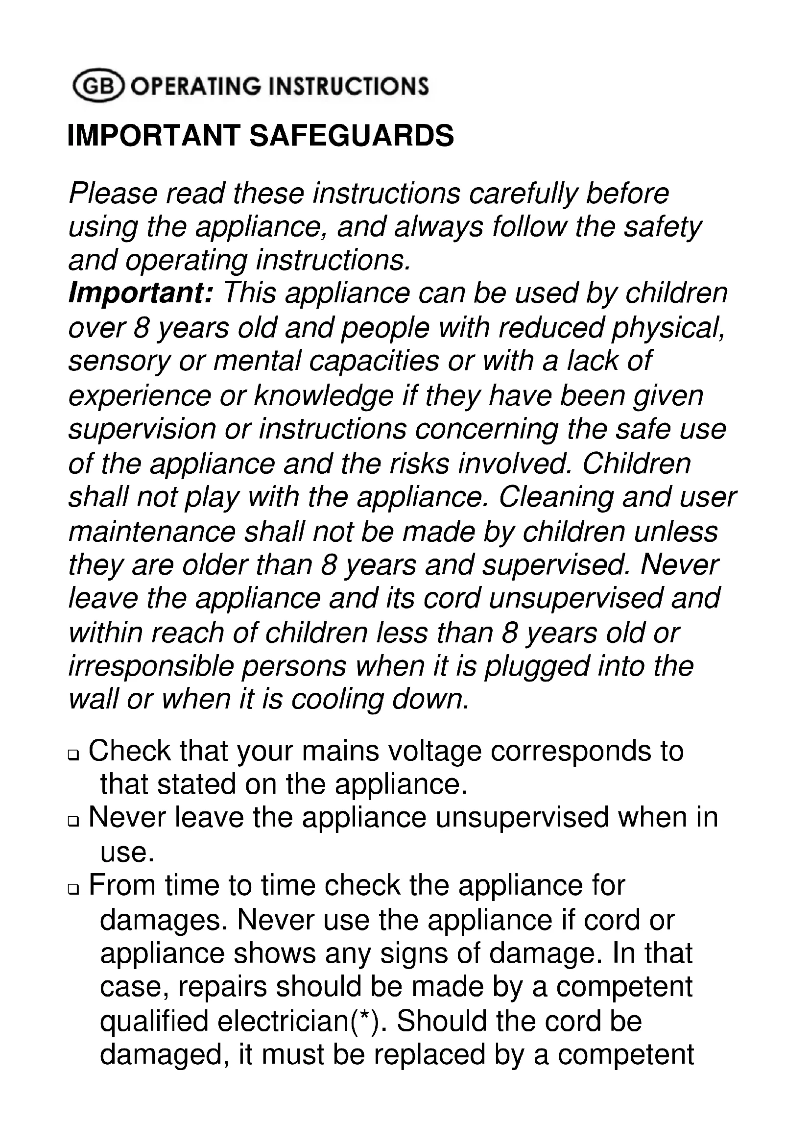 IMPORTANT SAFEGUARDS Please read these instructions carefully before using the appliance, and always follow the safety and operating instructions. Important: This appliance can be used by children over 8 years old and people with reduced physical, sensory or mental capacities or with a lack of experience or knowledge if they have been given supervision or instructions concerning the safe use of the appliance and the risks involved. Children shall not play with the appliance. Cleaning and user maintenance shall not be made by children unless they are older than 8 years and supervised. Never leave the appliance and its cord unsupervised and within reach of children less than 8 years old or irresponsible persons when it is plugged into the wall or when it is cooling down. Check that your mains voltage corresponds to that stated on the appliance. Never leave the appliance unsupervised when in use. From time to time check the appliance for damages. Never use the appliance if cord or appliance shows any signs of damage. In that case, repairs should be made by a competent qualified electrician(*). Should the cord be damaged, it must be replaced by a competent15