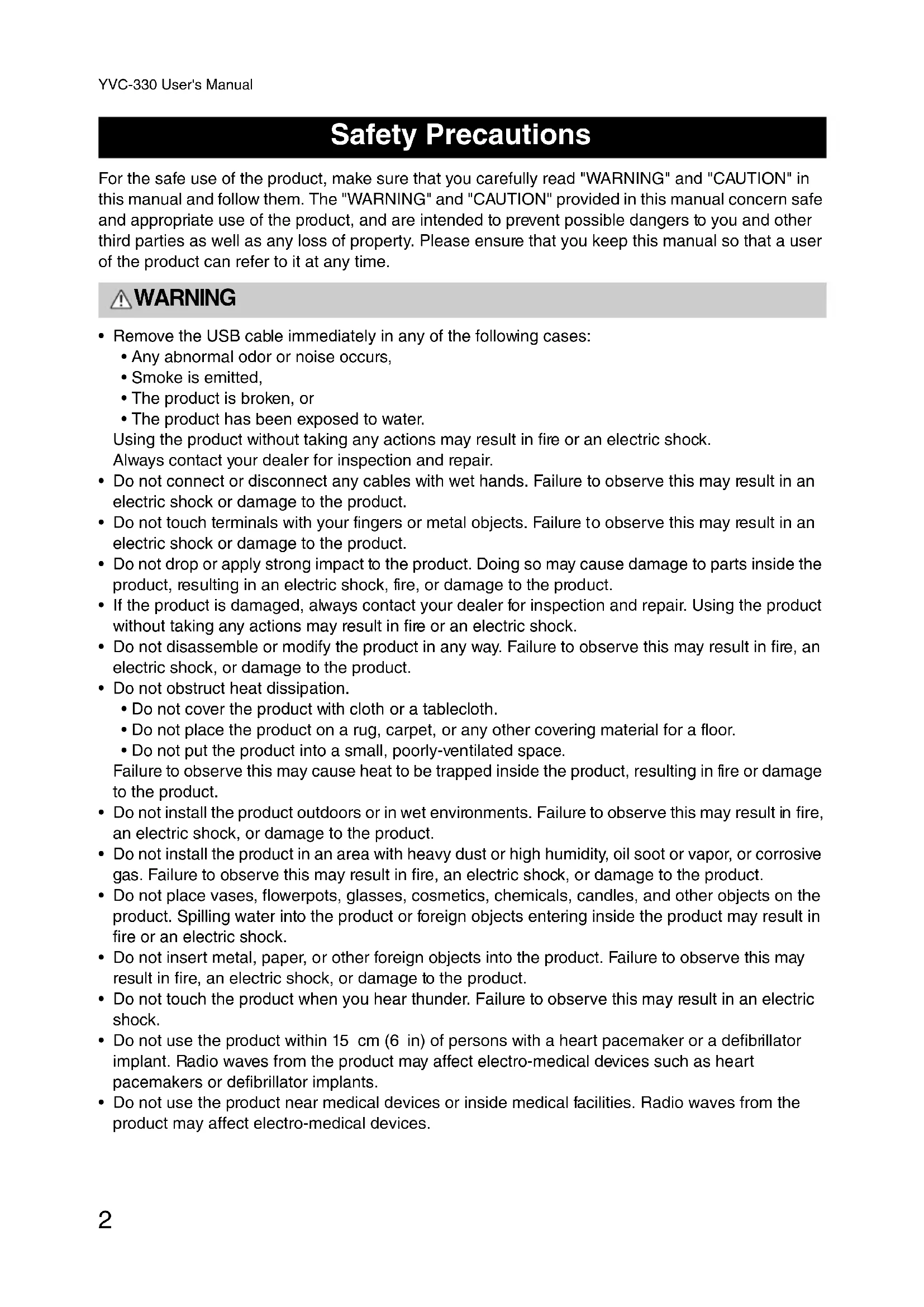 oduct may affect electro-medical devices. Safety Precautions WARNING3 YVC-330 User's Manual English