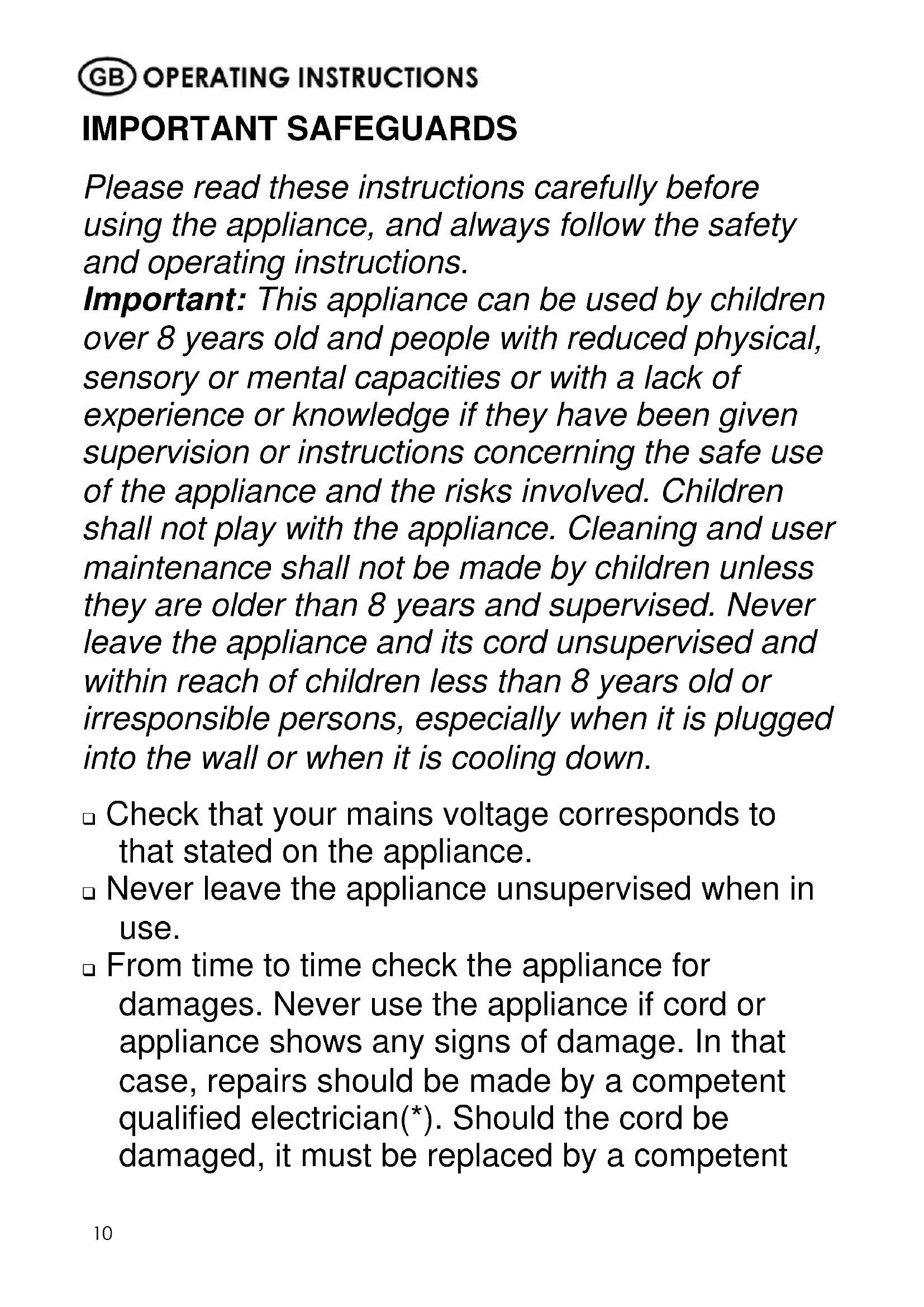 IMPORTANT SAFEGUARDS Please read these instructions carefully before using the appliance, and always follow the safety and operating instructions. Important: This appliance can be used by children over 8 years old and people with reduced physical, sensory or mental capacities or with a lack of experience or knowledge if they have been given supervision or instructions concerning the safe use of the appliance and the risks involved. Children shall not play with the appliance. Cleaning and user maintenance shall not be made by children unless they are older than 8 years and supervised. Never leave the appliance and its cord unsupervised and within reach of children less than 8 years old or irresponsible persons, especially when it is plugged into the wall or when it is cooling down. Check that your mains voltage corresponds to that stated on the appliance. Never leave the appliance unsupervised when in use. From time to time check the appliance for damages. Never use the appliance if cord or appliance shows any signs of damage. In that case, repairs should be made by a competent qualified electrician(*). Should the cord be damaged, it must be replaced by a competent.