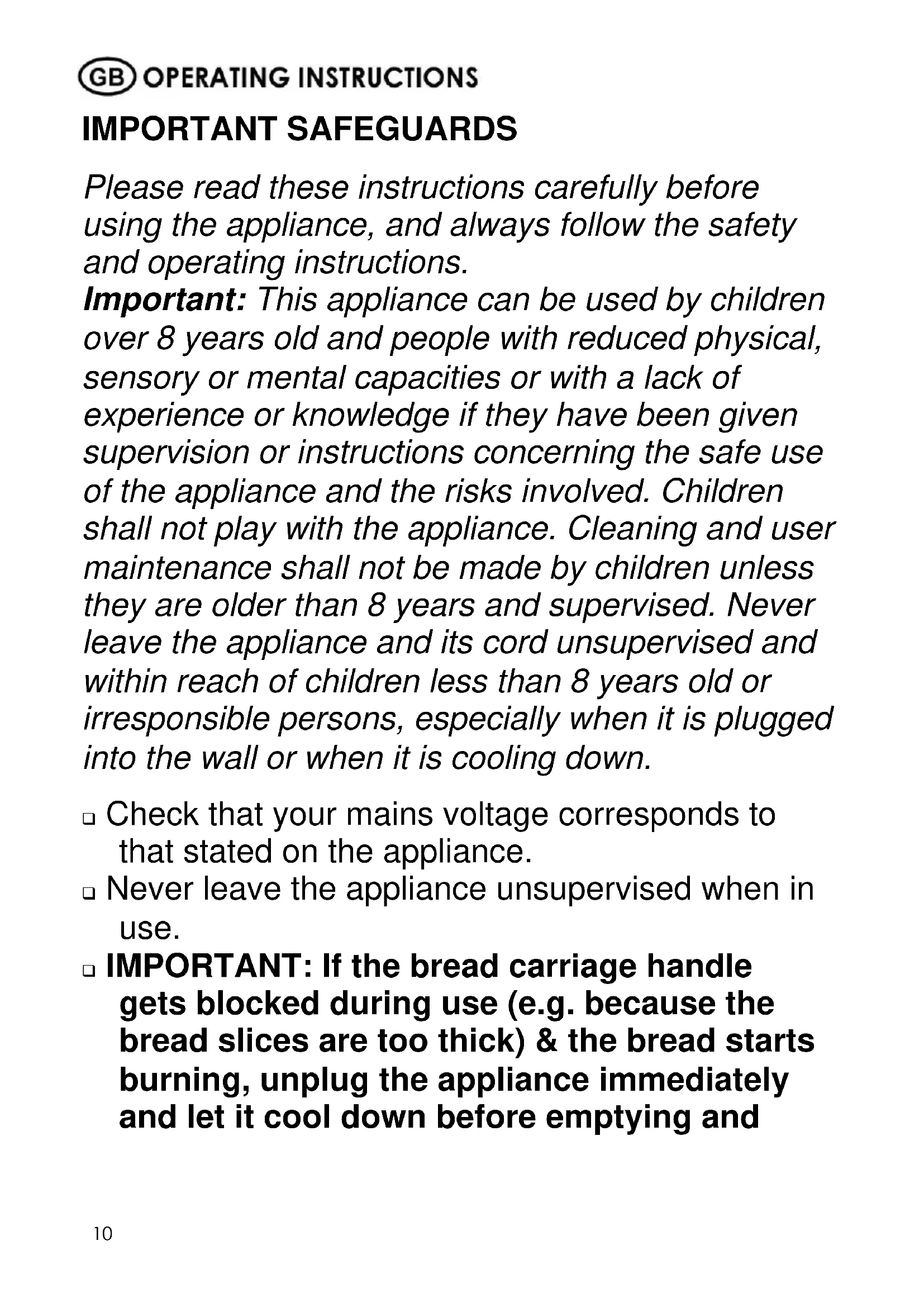 IMPORTANT SAFEGUARDS Please read these instructions carefully before using the appliance, and always follow the safety and operating instructions. Important: This appliance can be used by children over 8 years old and people with reduced physical, sensory or mental capacities or with a lack of experience or knowledge if they have been given supervision or instructions concerning the safe use of the appliance and the risks involved. Children shall not play with the appliance. Cleaning and user maintenance shall not be made by children unless they are older than 8 years and supervised. Never leave the appliance and its cord unsupervised and within reach of children less than 8 years old or irresponsible persons, especially when it is plugged into the wall or when it is cooling down. Check that your mains voltage corresponds to that stated on the appliance. Never leave the appliance unsupervised when in use. IMPORTANT: If the bread carriage handle gets blocked during use (e.g. because the bread slices are too thick) & the bread starts burning, unplug the appliance immediately and let it cool down before emptying and11