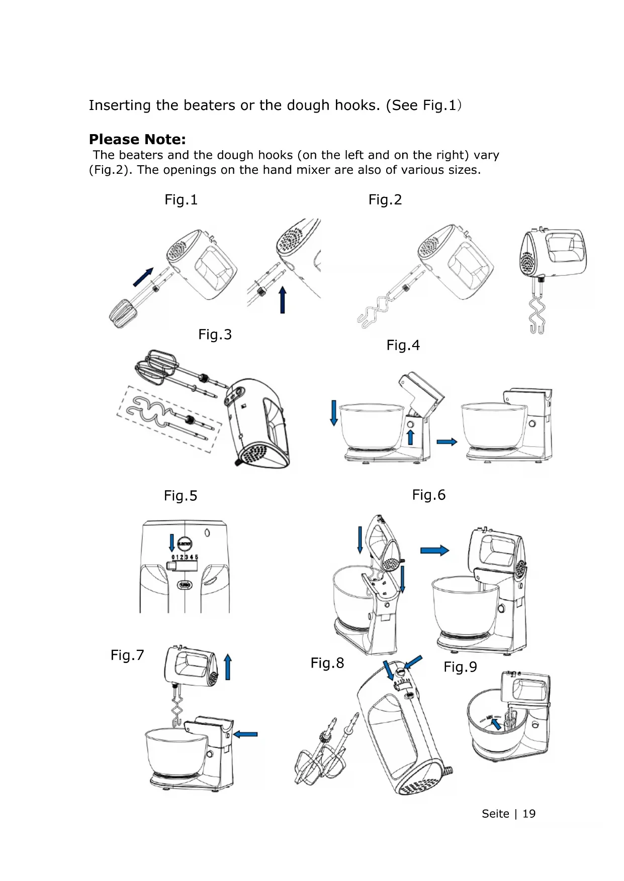 Inserting the beaters or the dough hooks. (See Fig.1) Please Note: The beaters and the dough hooks (on the left and on the right) vary (Fig.2). The openings on the hand mixer are also of various sizes. Fig.1 Fig.2