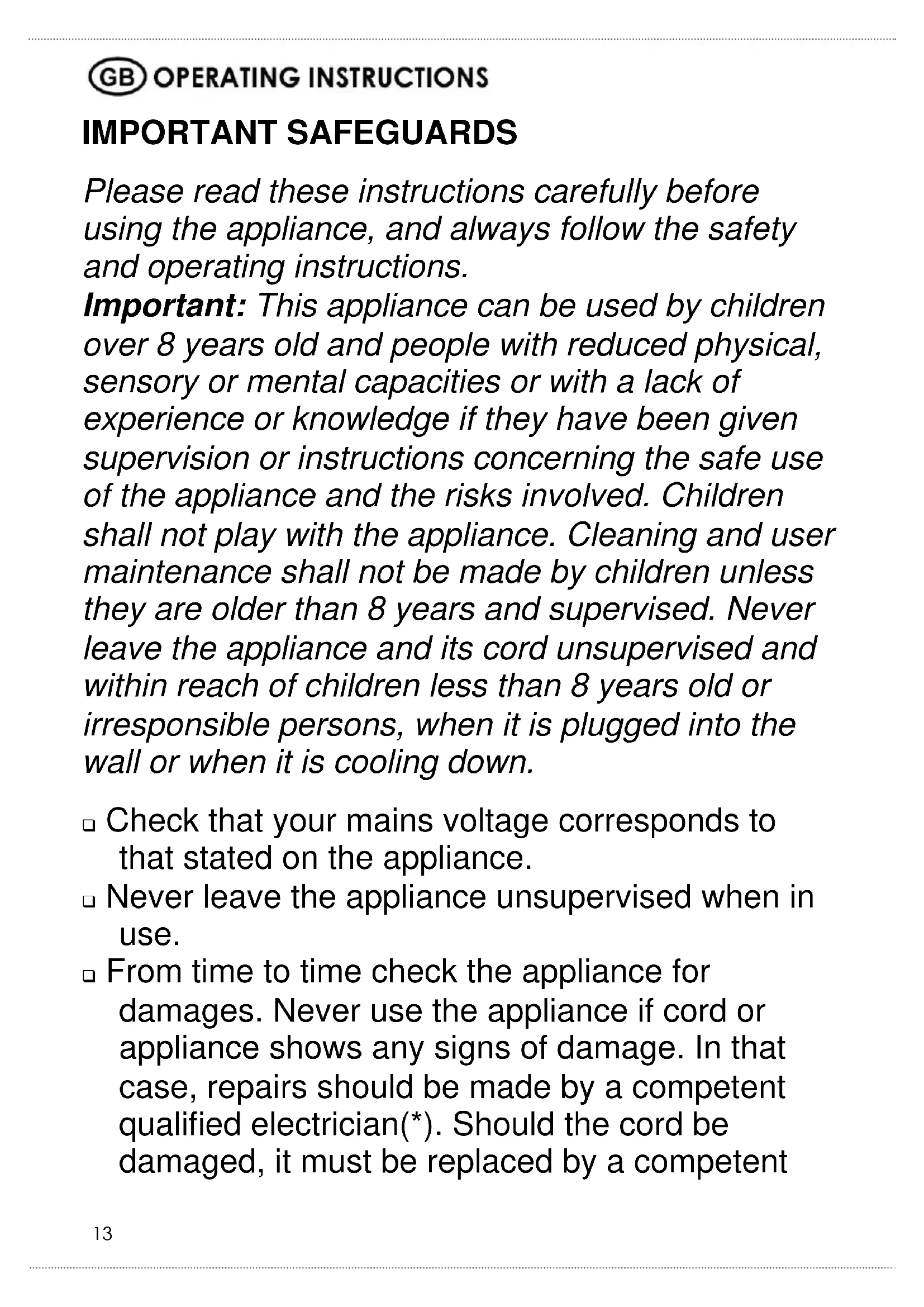 IMPORTANT SAFEGUARDS Please read these instructions carefully before using the appliance, and always follow the safety and operating instructions. Important: This appliance can be used by children over 8 years old and people with reduced physical, sensory or mental capacities or with a lack of experience or knowledge if they have been given supervision or instructions concerning the safe use of the appliance and the risks involved. Children shall not play with the appliance. Cleaning and user maintenance shall not be made by children unless they are older than 8 years and supervised. Never leave the appliance and its cord unsupervised and within reach of children less than 8 years old or irresponsible persons, when it is plugged into the wall or when it is cooling down. Check that your mains voltage corresponds to that stated on the appliance. Never leave the appliance unsupervised when in use. From time to time check the appliance for damages. Never use the appliance if cord or appliance shows any signs of damage. In that case, repairs should be made by a competent qualified electrician(*). Should the cord be damaged, it must be replaced by a competent
