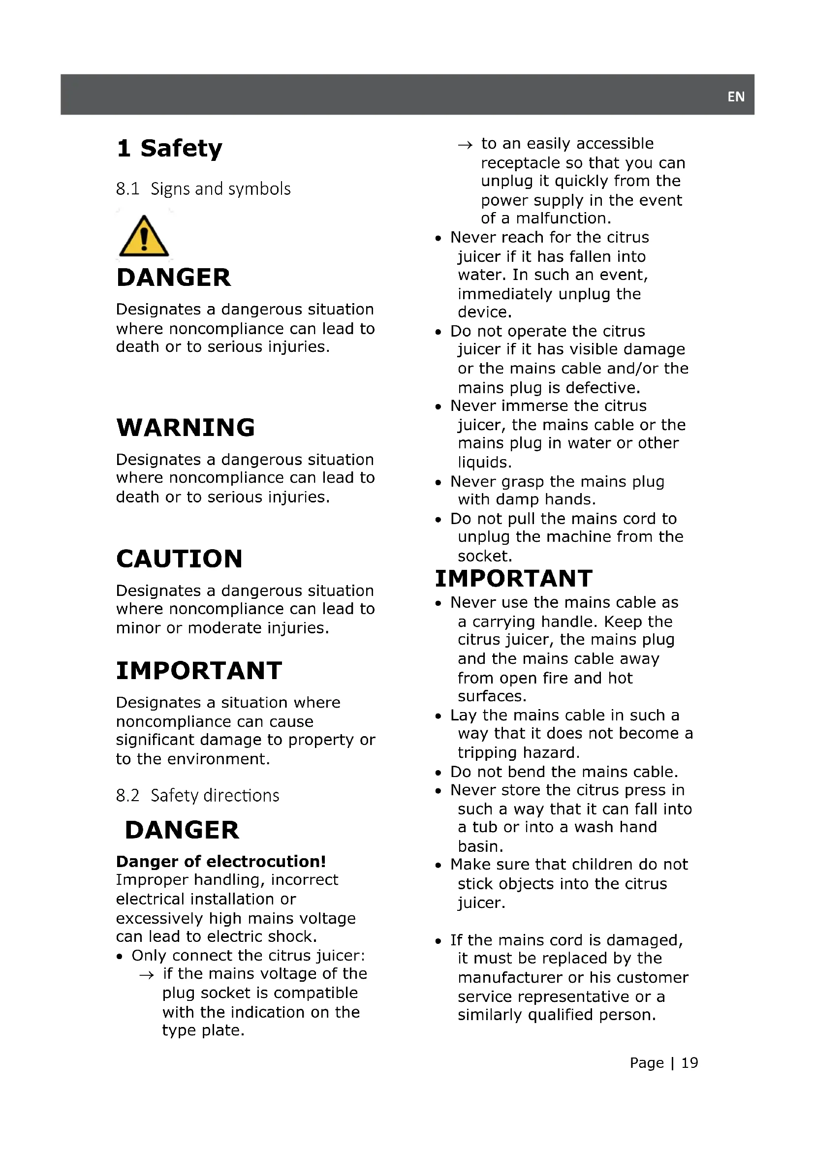 8.2 Safety directions 19