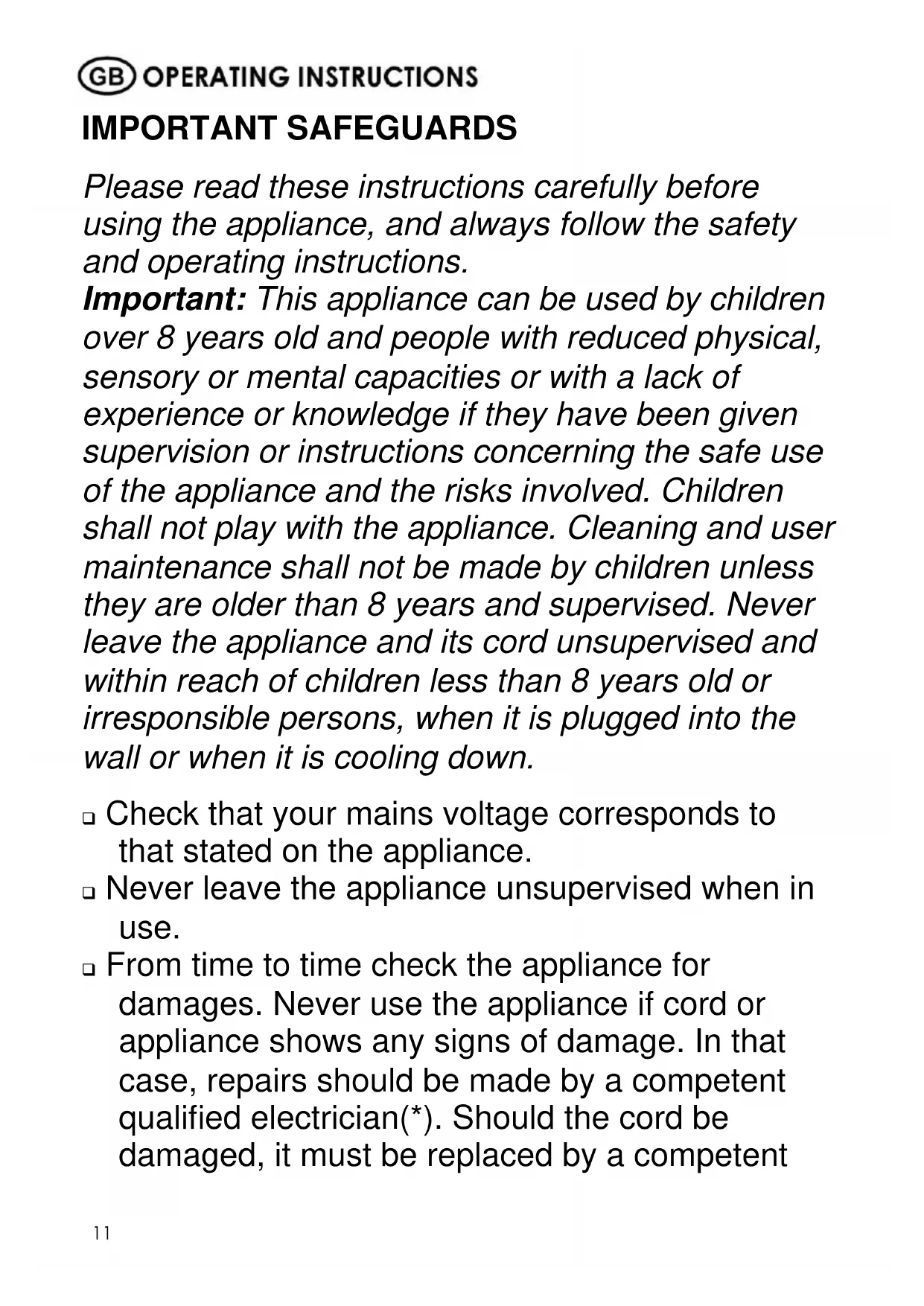 IMPORTANT SAFEGUARDS Please read these instructions carefully before using the appliance, and always follow the safety and operating instructions. Important: This appliance can be used by children over 8 years old and people with reduced physical, sensory or mental capacities or with a lack of experience or knowledge if they have been given supervision or instructions concerning the safe use of the appliance and the risks involved. Children shall not play with the appliance. Cleaning and user maintenance shall not be made by children unless they are older than 8 years and supervised. Never leave the appliance and its cord unsupervised and within reach of children less than 8 years old or irresponsible persons, when it is plugged into the wall or when it is cooling down. Check that your mains voltage corresponds to that stated on the appliance. Never leave the appliance unsupervised when in use. From time to time check the appliance for damages. Never use the appliance if cord or appliance shows any signs of damage. In that case, repairs should be made by a competent qualified electrician(*). Should the cord be damaged, it must be replaced by a competent12
