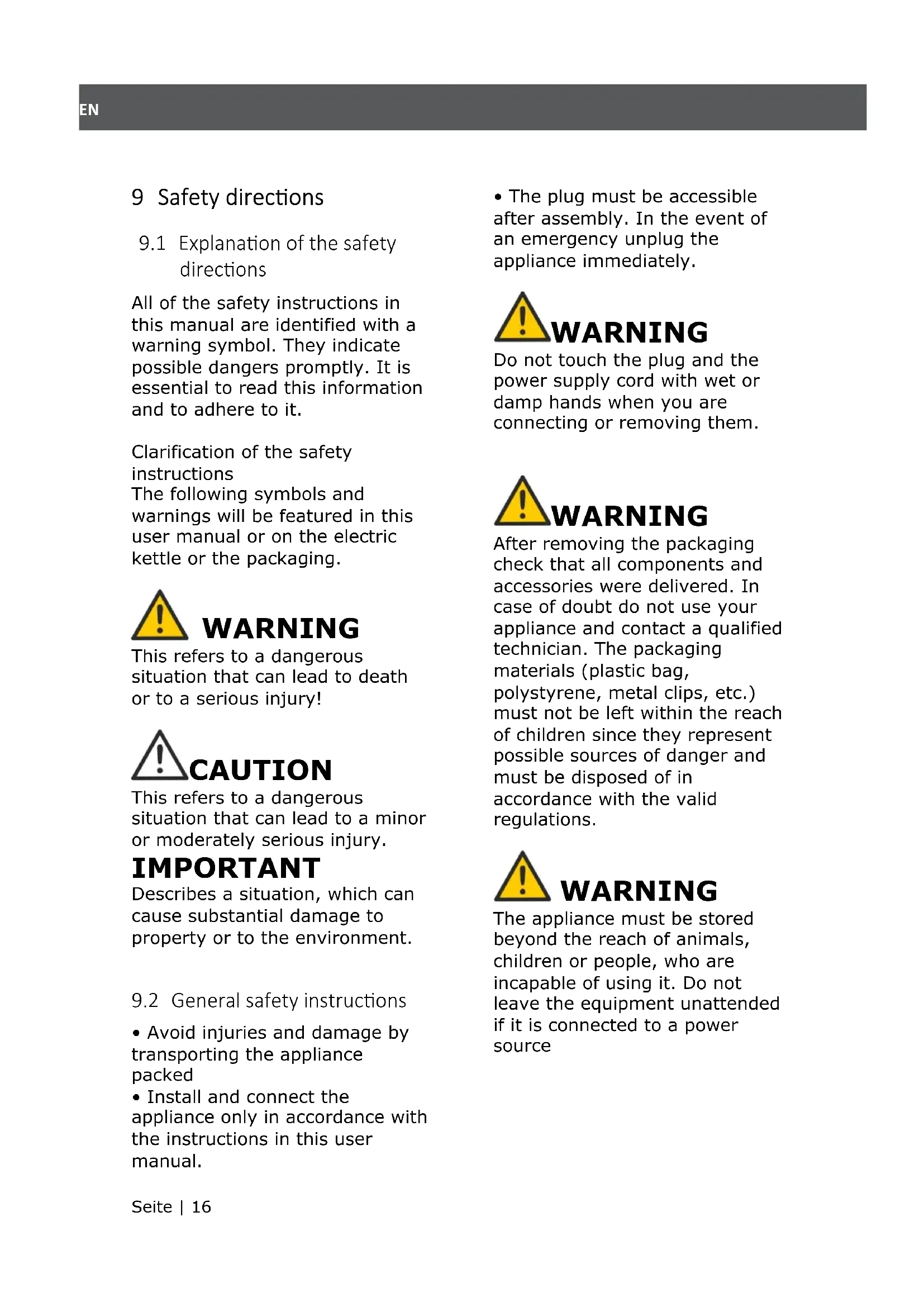 directions All of the safety instructions in this manual are identified with a warning symbol. They indicate possible dangers promptly. It is essential to read this information and to adhere to it. Clarification of the safety instructions The following symbols and warnings will be featured in this user manual or on the electric kettle or the packaging.